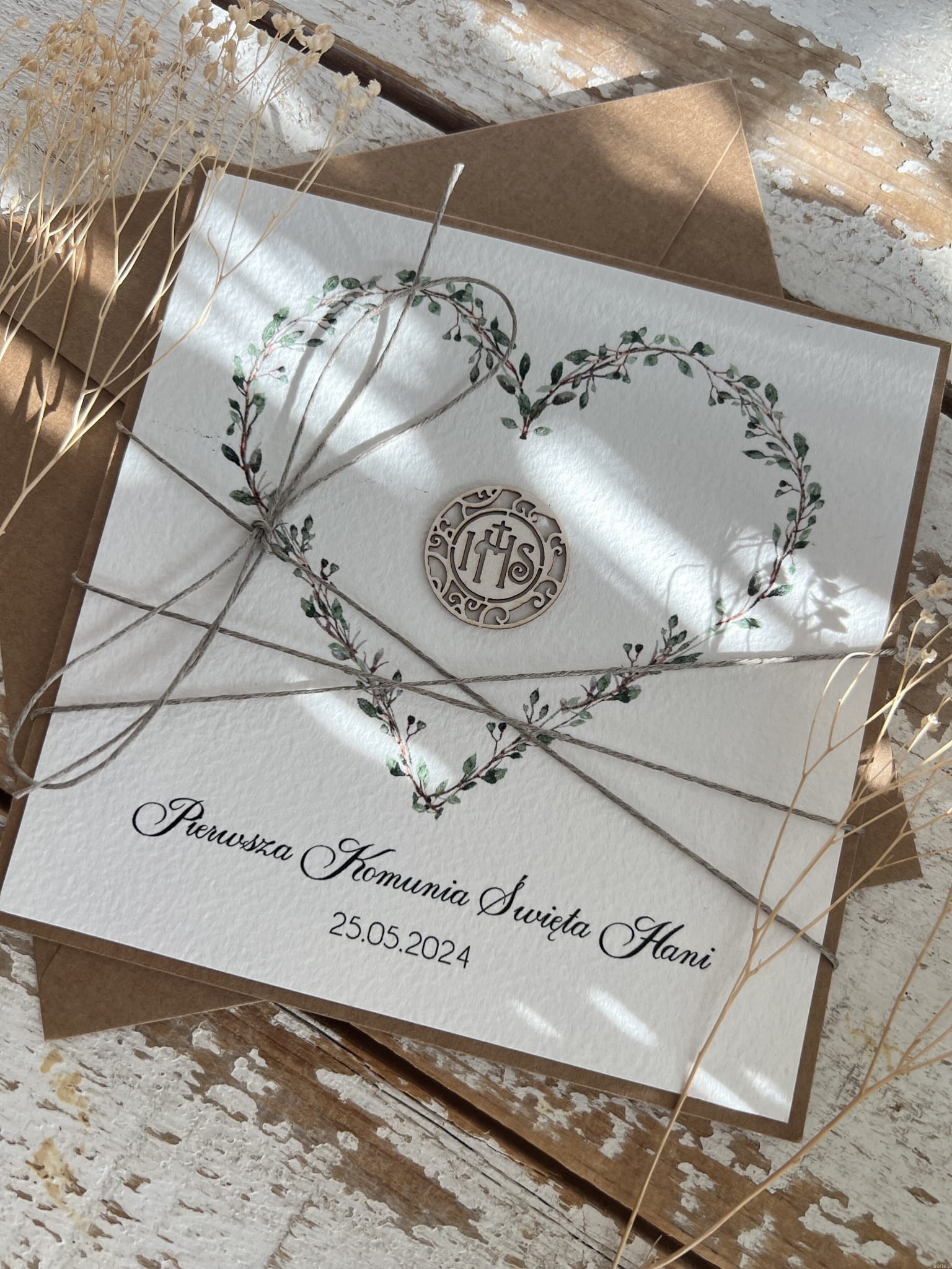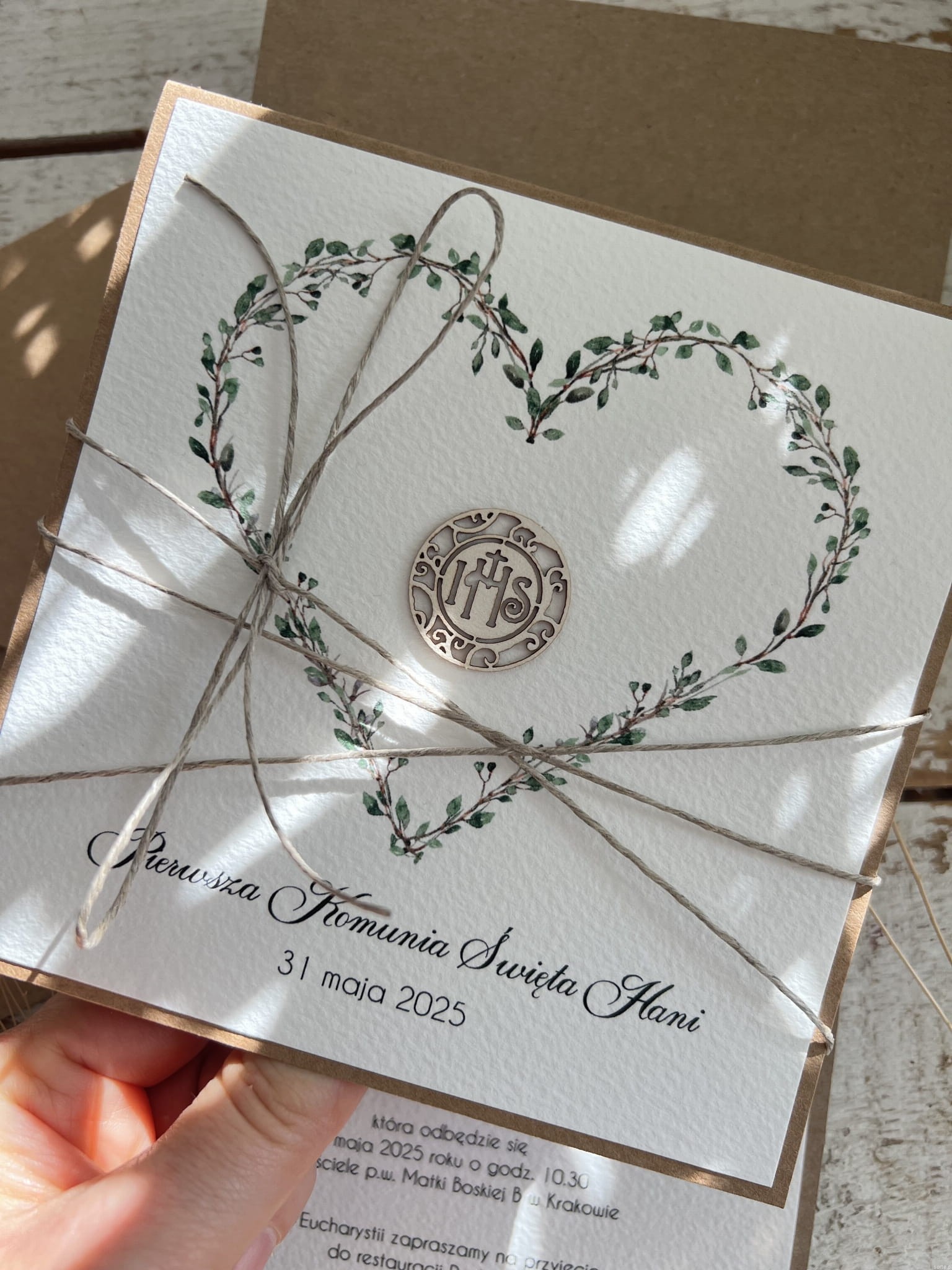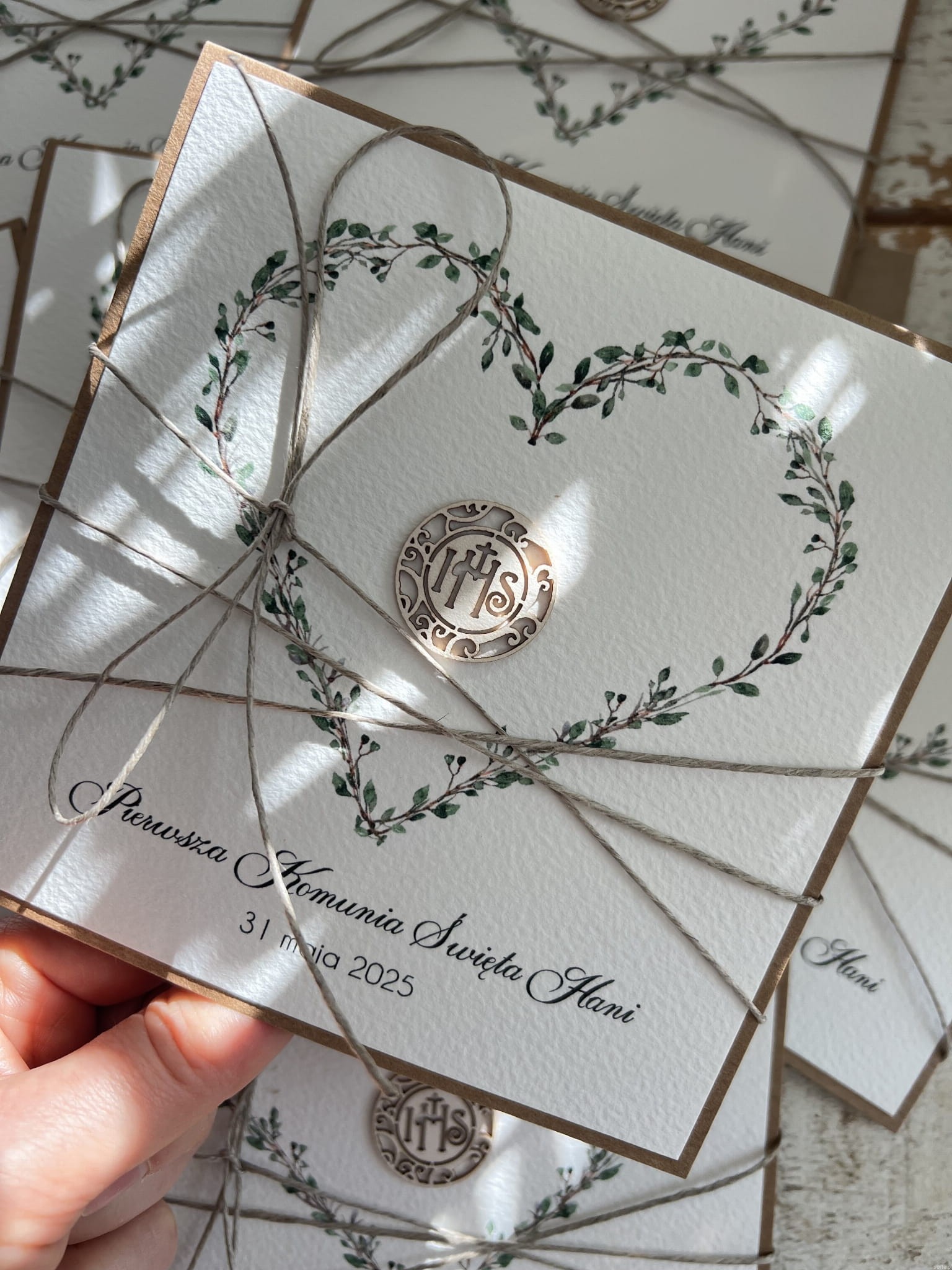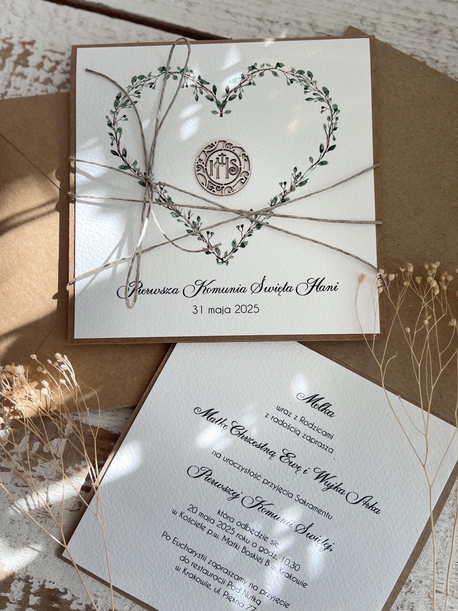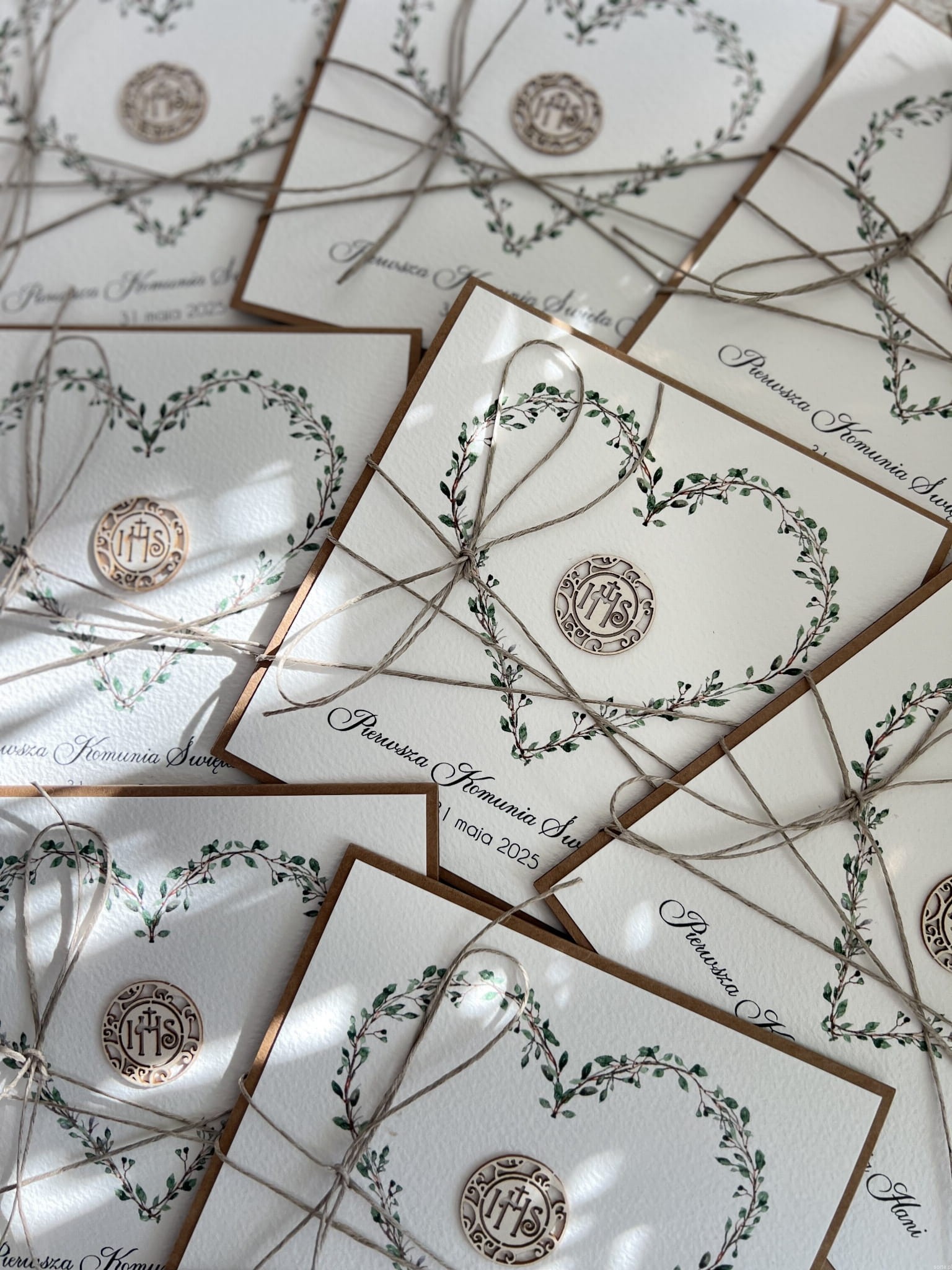 Eleganckie zaproszenia komunijne ręcznie robione z sercem IHS