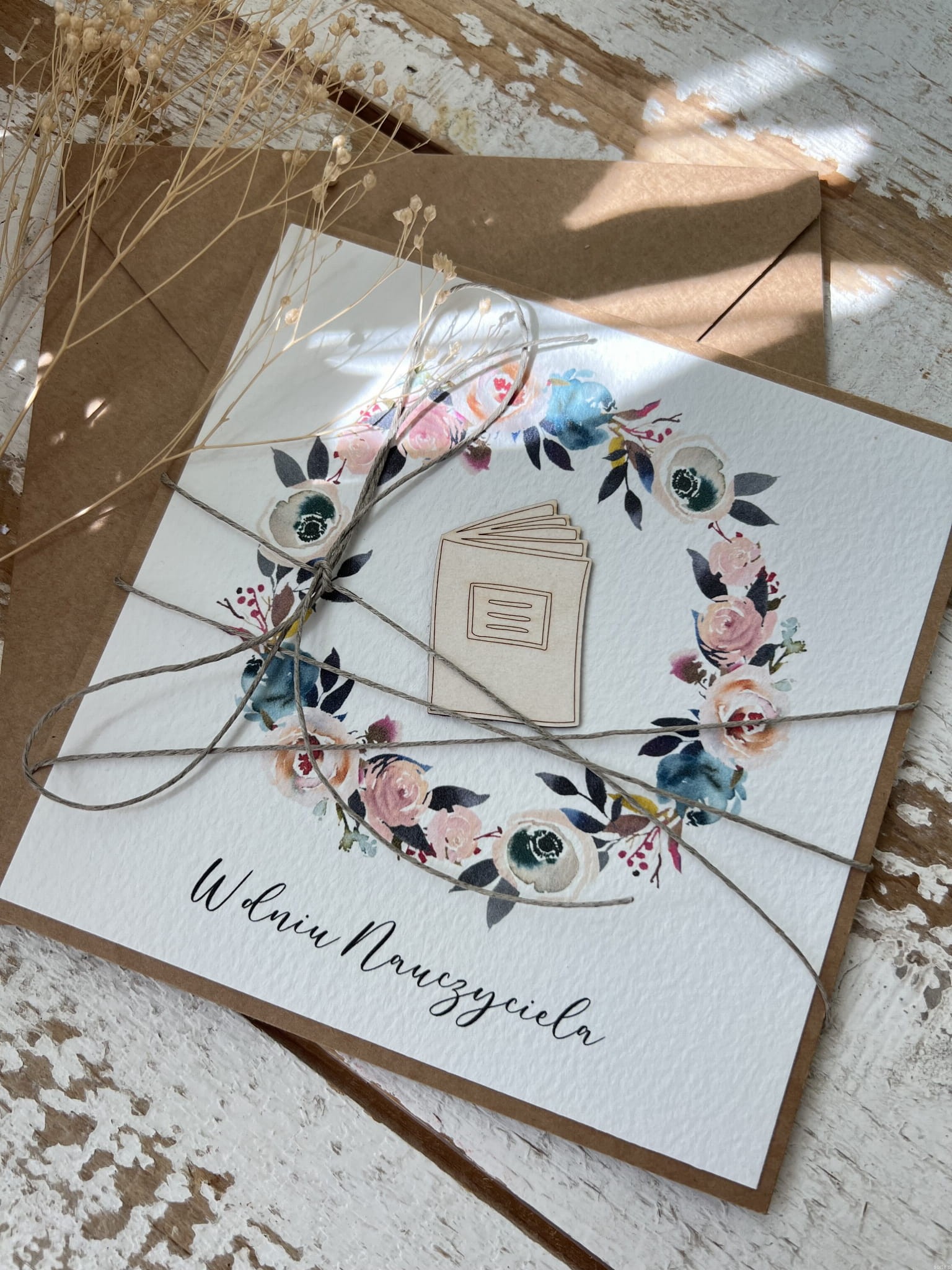 Kartka wykonana jest na bazie papieru kraftowego z użyciem starannie wyselekcjonowanego papieru bawełnianego w kolorze ecri oraz ozdoby tekturkowej. Zestaw przewiązany jest lnianym sznureczkiem.