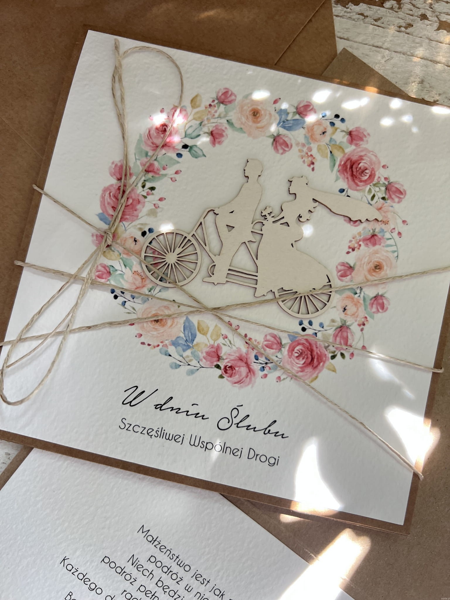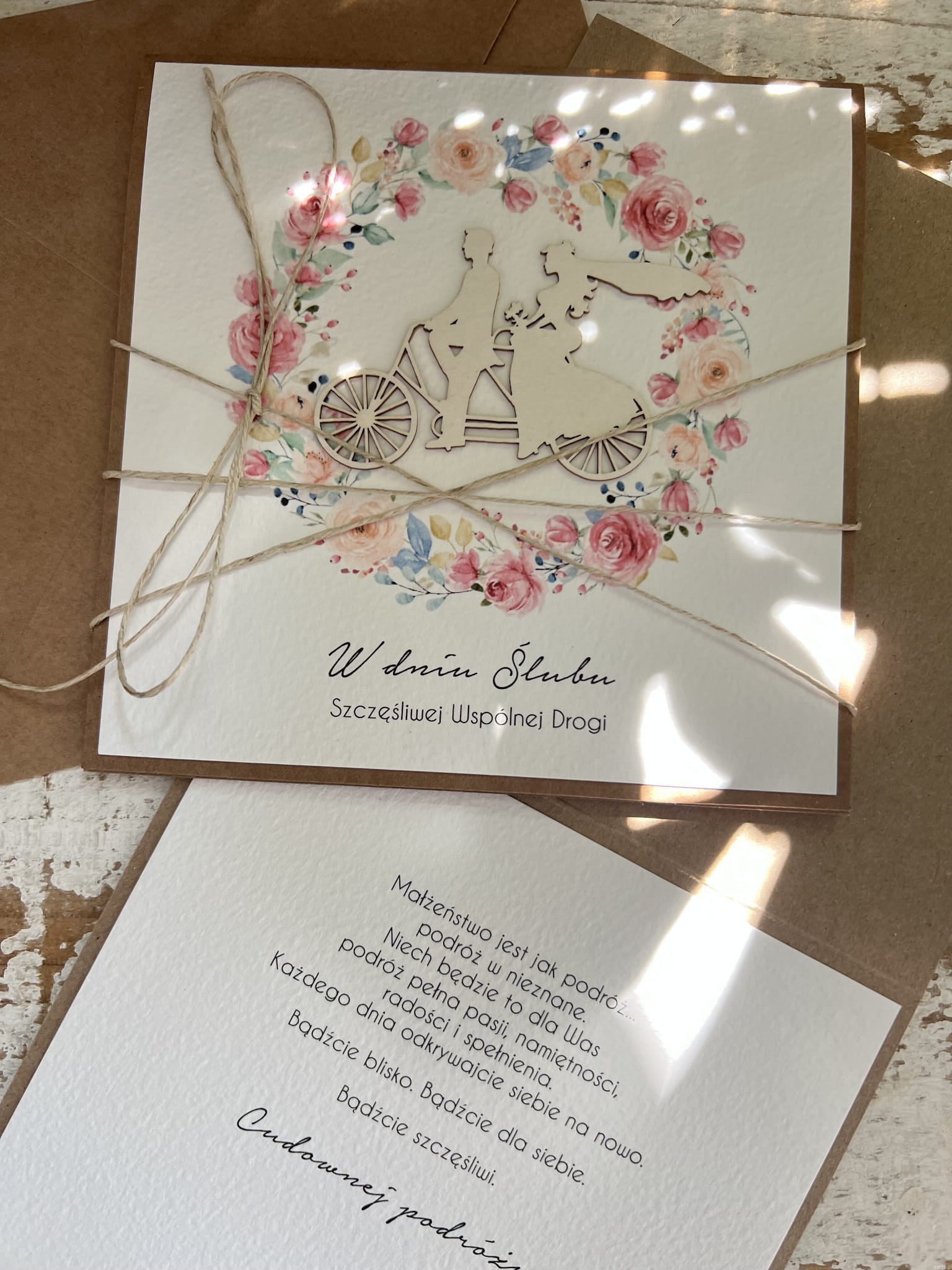 Ręcznie robiona kartka ślubna w dniu ślubu najpiękniejsze życzenia ślubne para młoda na rowerze SORTE.pl