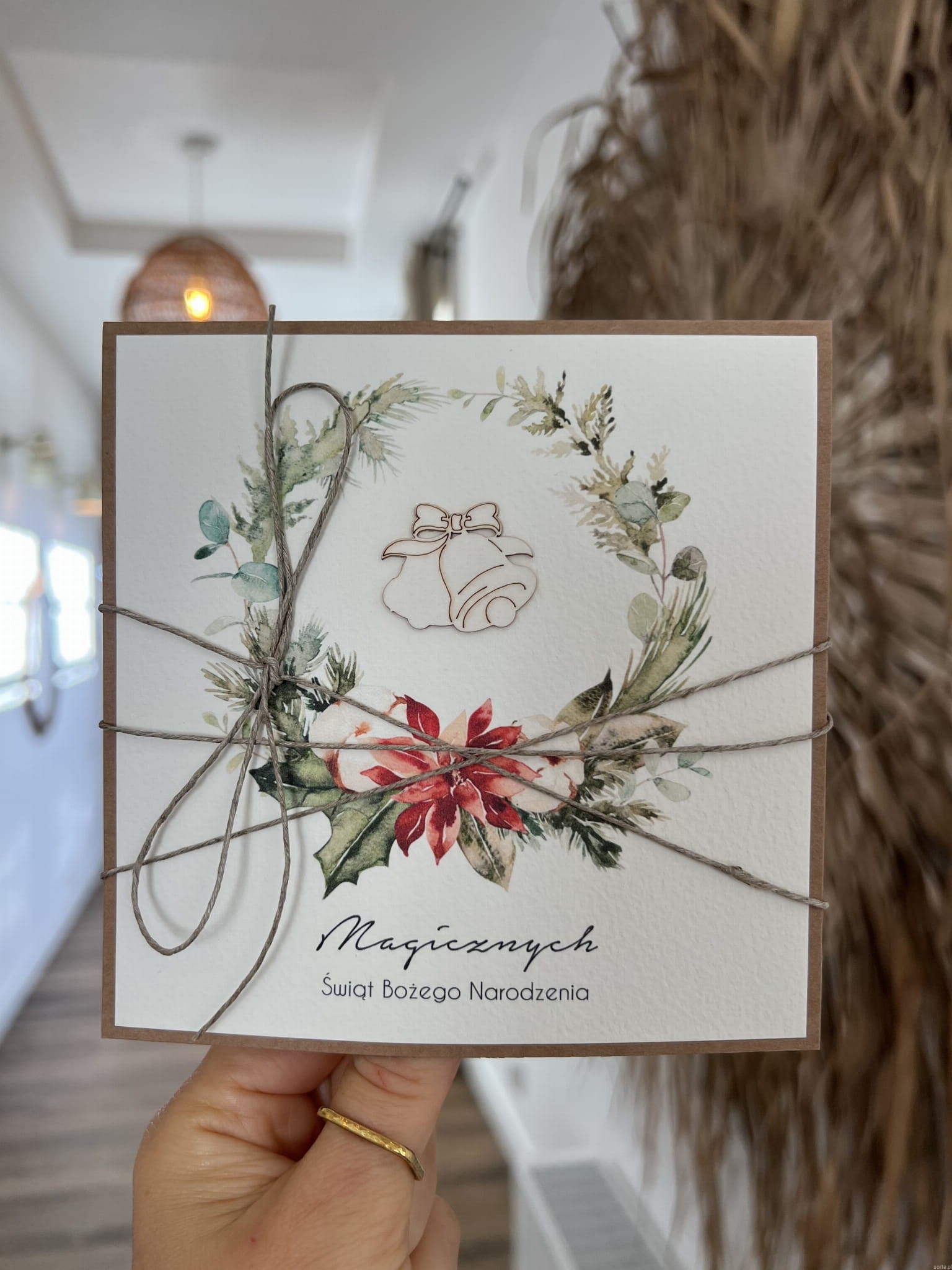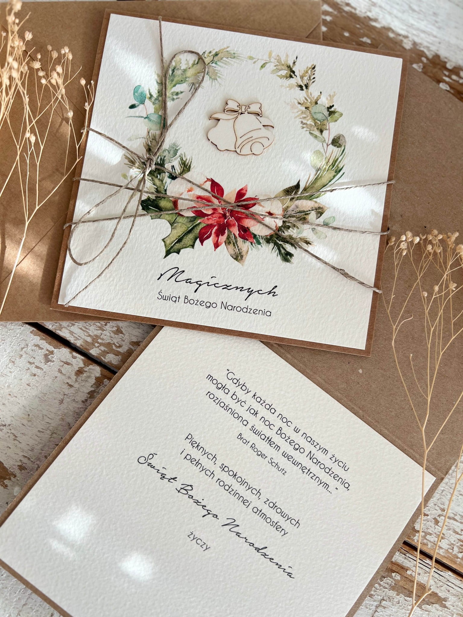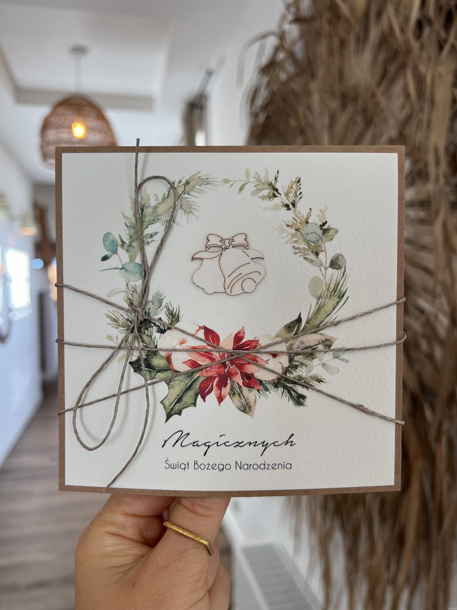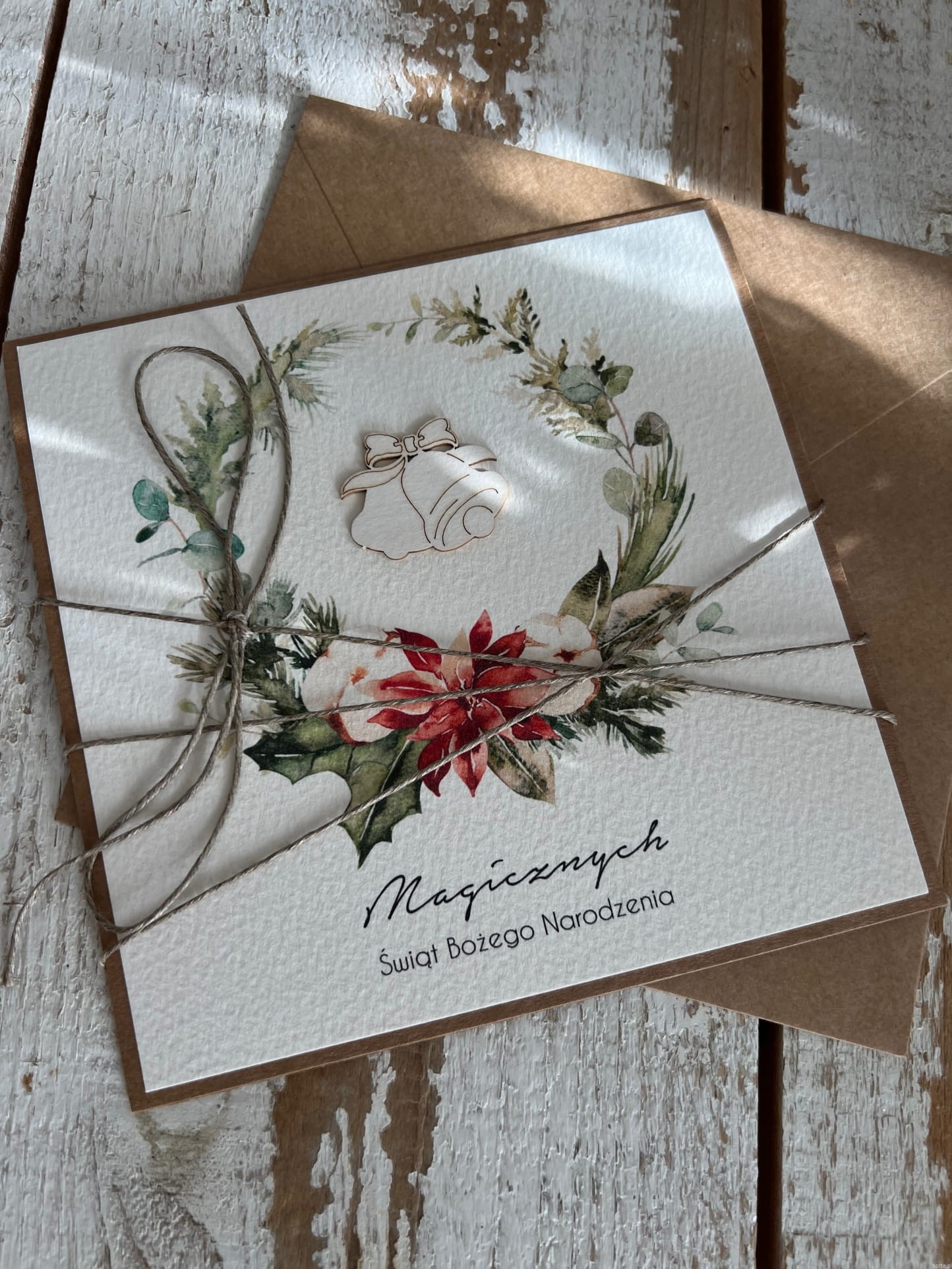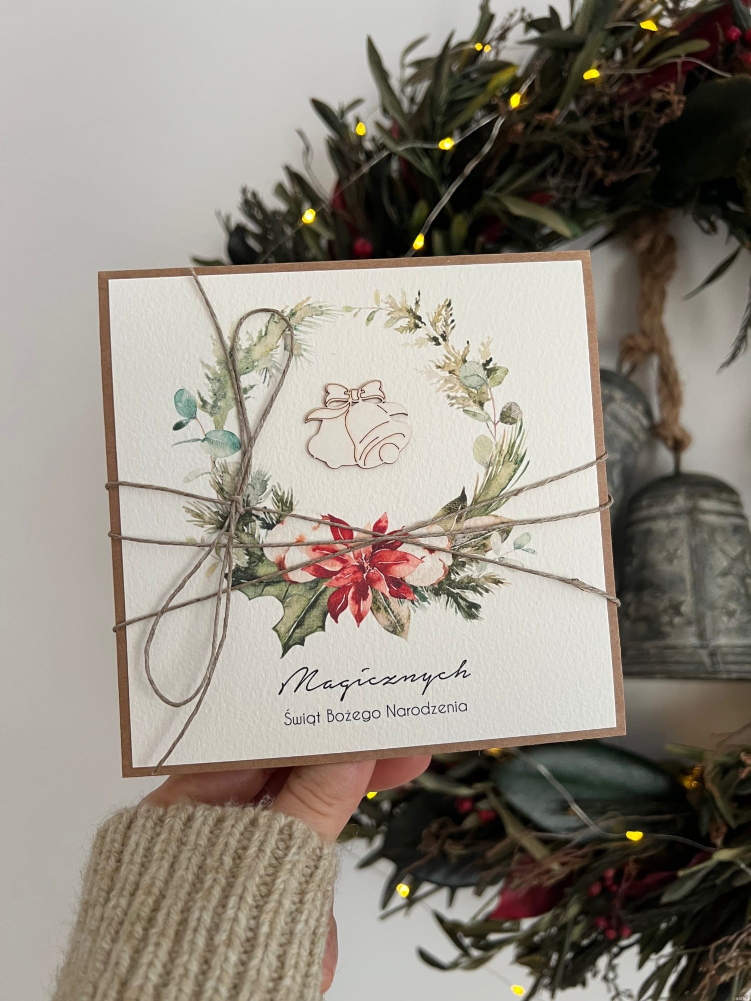 Wyjątkowa stylowa kartka ekologiczna świąteczna + najpiękniejsze życzenia na Boże Narodzenie świąteczny wianek + świąteczne dzwonki