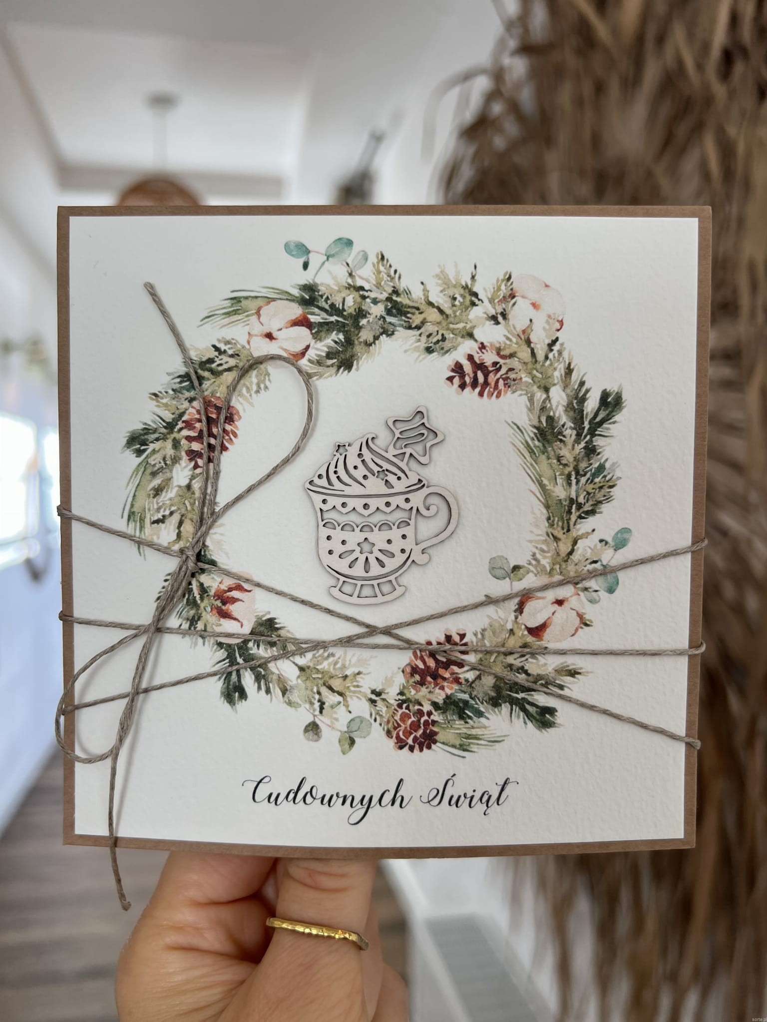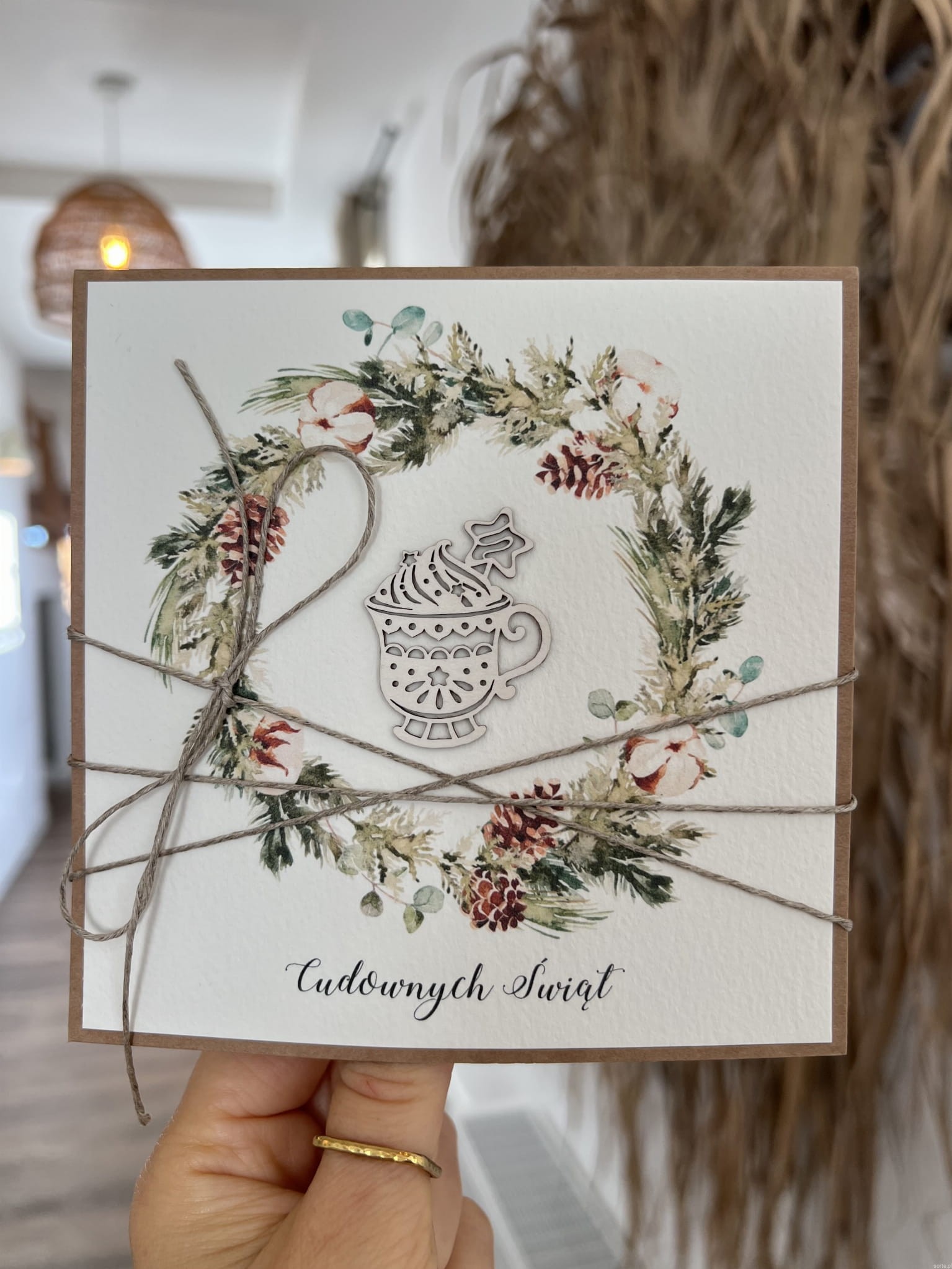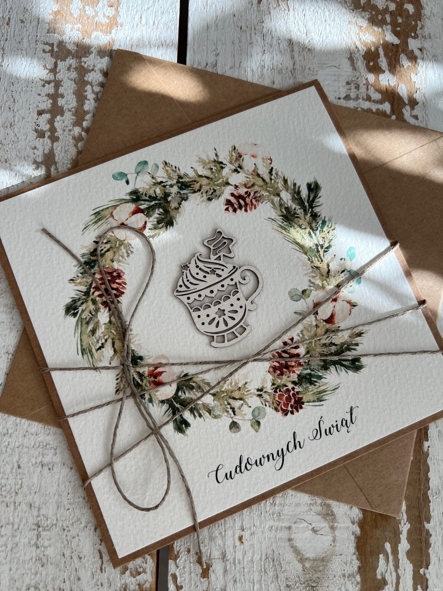 Wyjątkowa stylowa kartka ekologiczna świąteczna + najpiękniejsze życzenia na Boże Narodzenie świąteczny wianek, deser