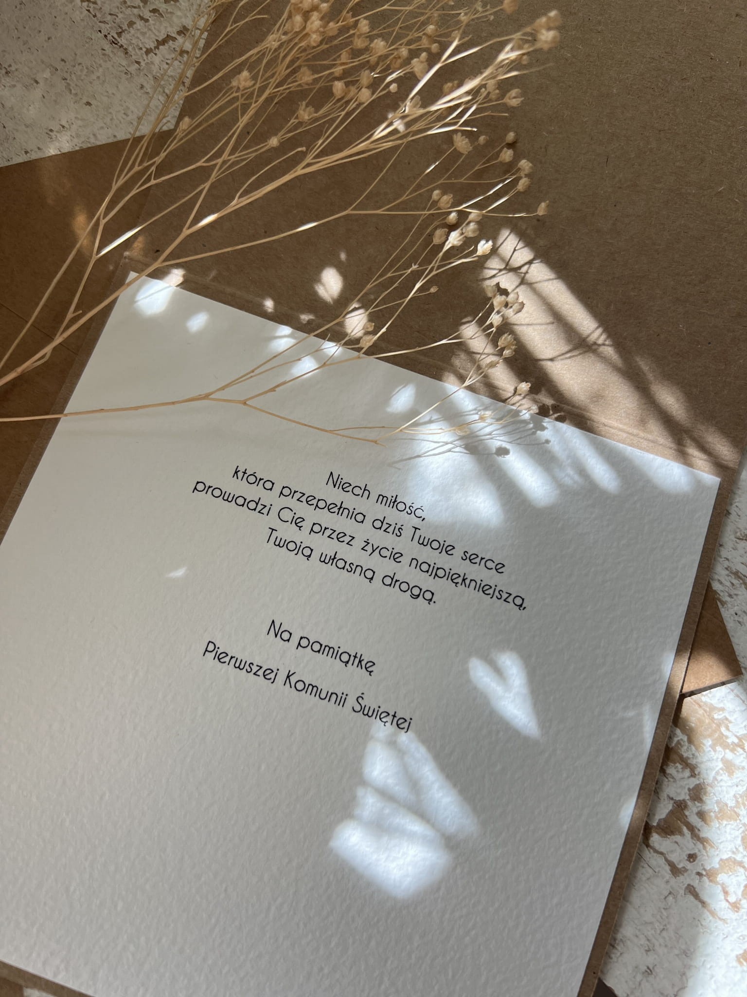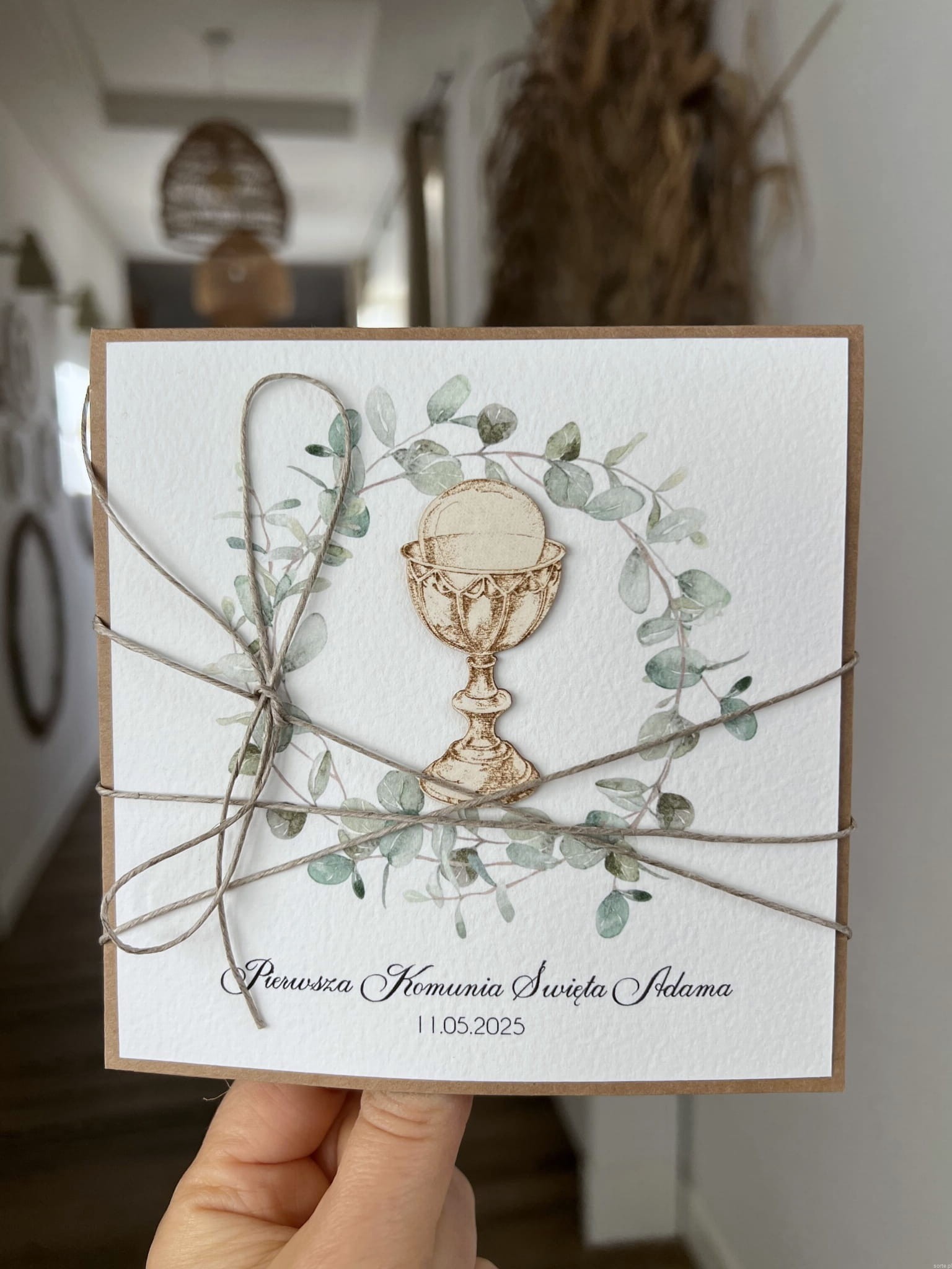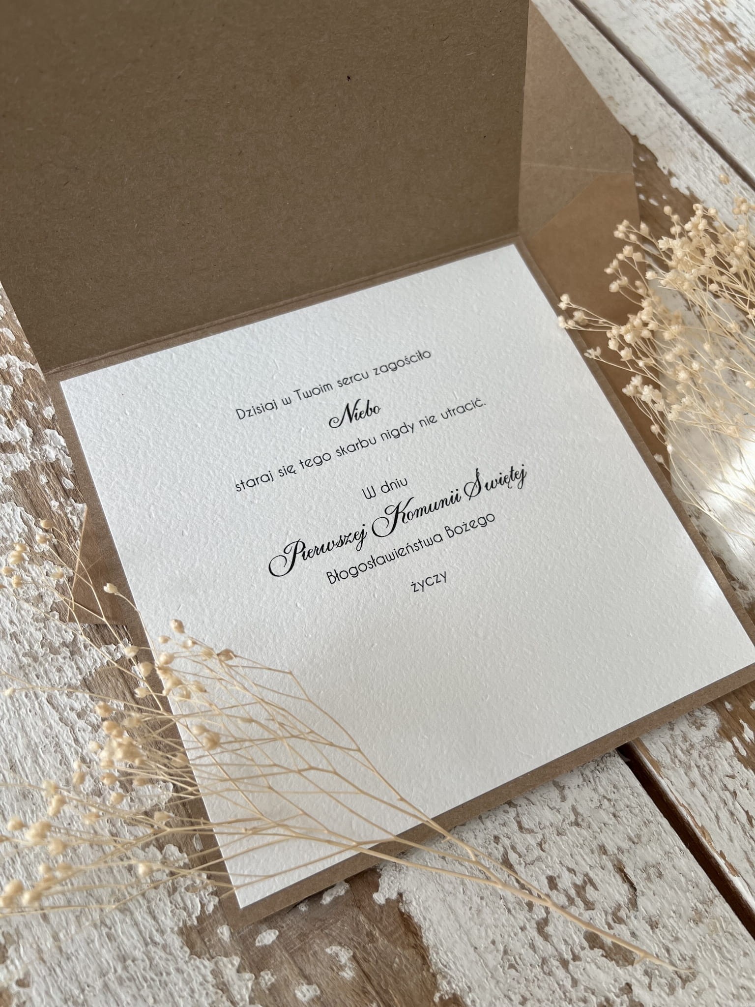 Wyjątkowa rustykalna kartka na komunię wykonana na bazie papieru kraftowego z użyciem starannie wyselekcjonowanego papieru bawełnianego w kolorze ecri oraz tekturkowej ozdoby. Kartka otwierana jest do góry. Przewiązana jest lnianym sznureczkiem. W zestawie brązowa koperta.