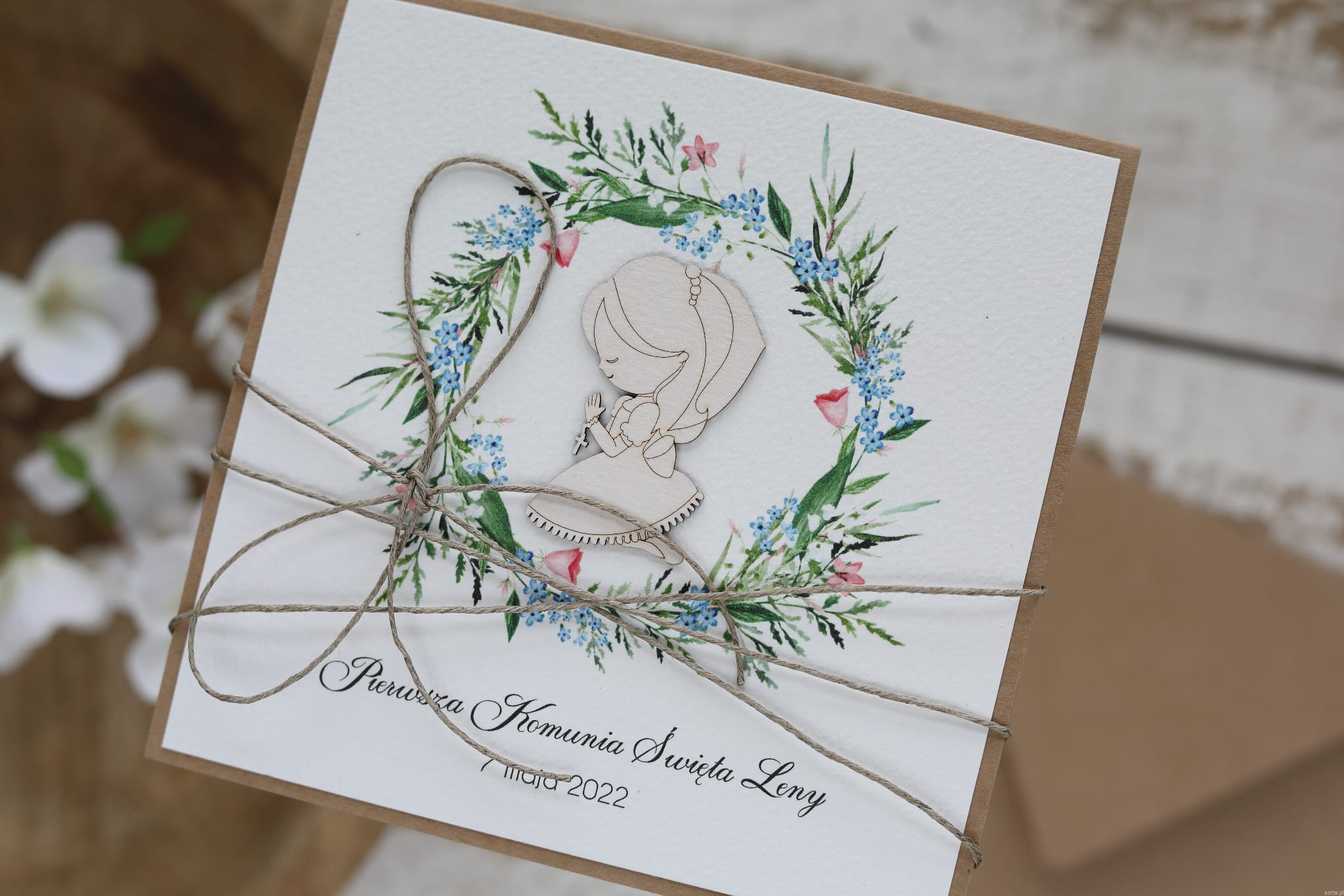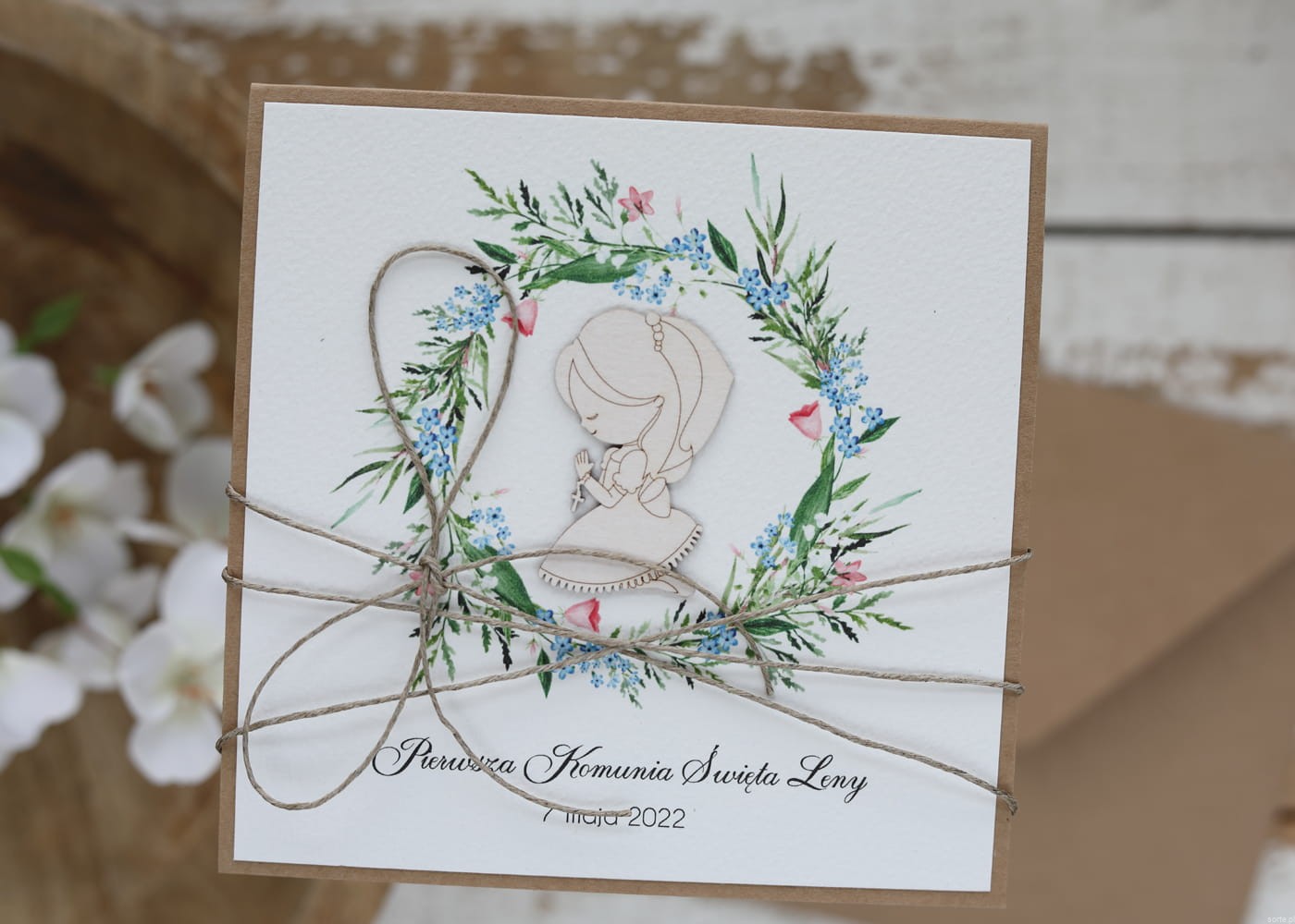 Rustykalna kartka na komunię handmade wykonana na bazie papieru kraftowego z użyciem starannie wyselekcjonowanego papieru bawełnianego w kolorze ecri oraz tekturkowej ozdoby. Kartka otwierana jest do góry. Przewiązana jest lnianym sznureczkiem. W zestawie brązowa koperta.