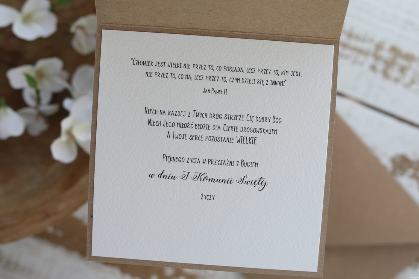 W środku wklejona jest jedna kartka z papieru bawełnianego z życzeniami bądź kartka pusta, gotowa do wpisania życzeń własnoręcznie.