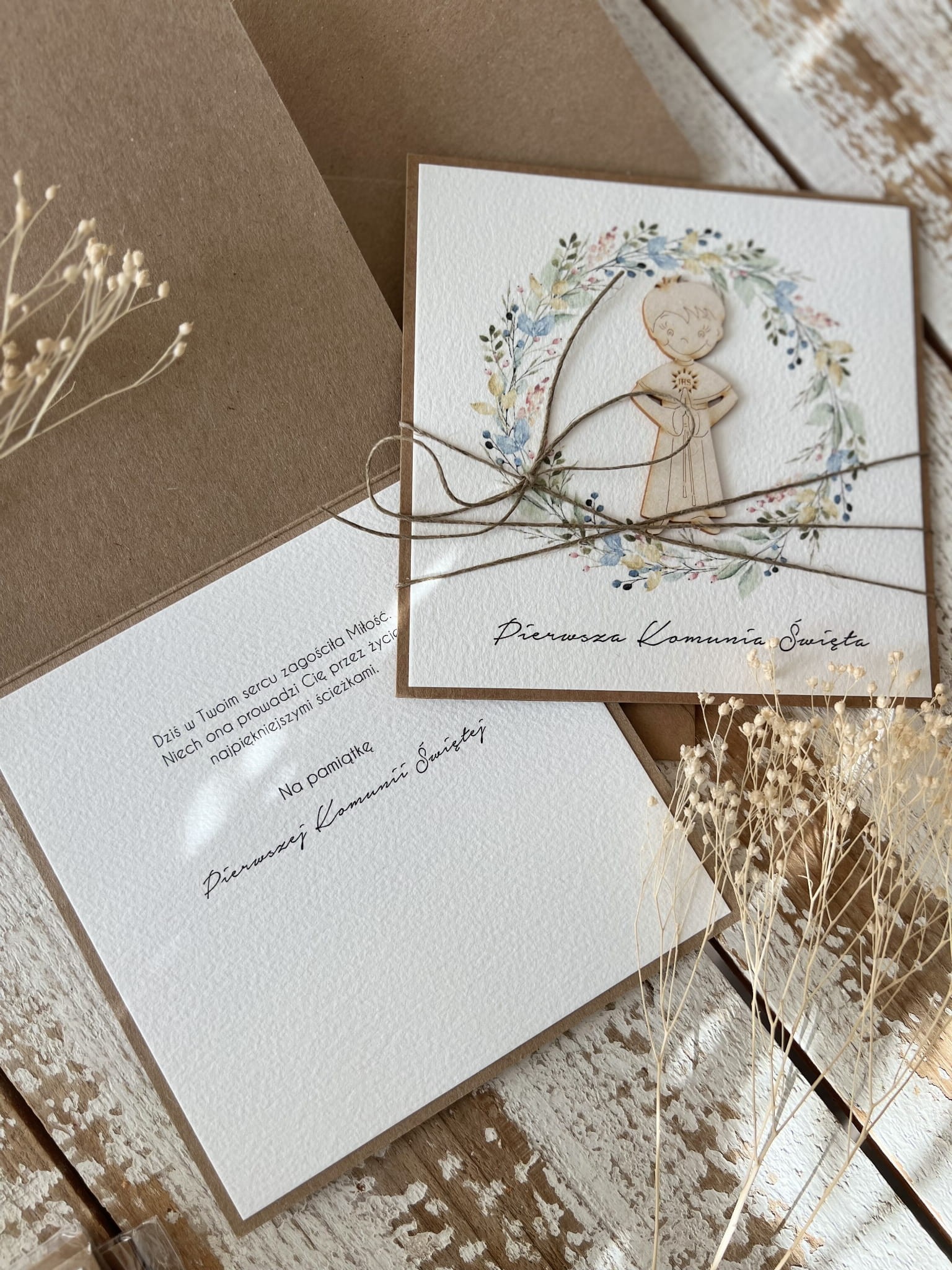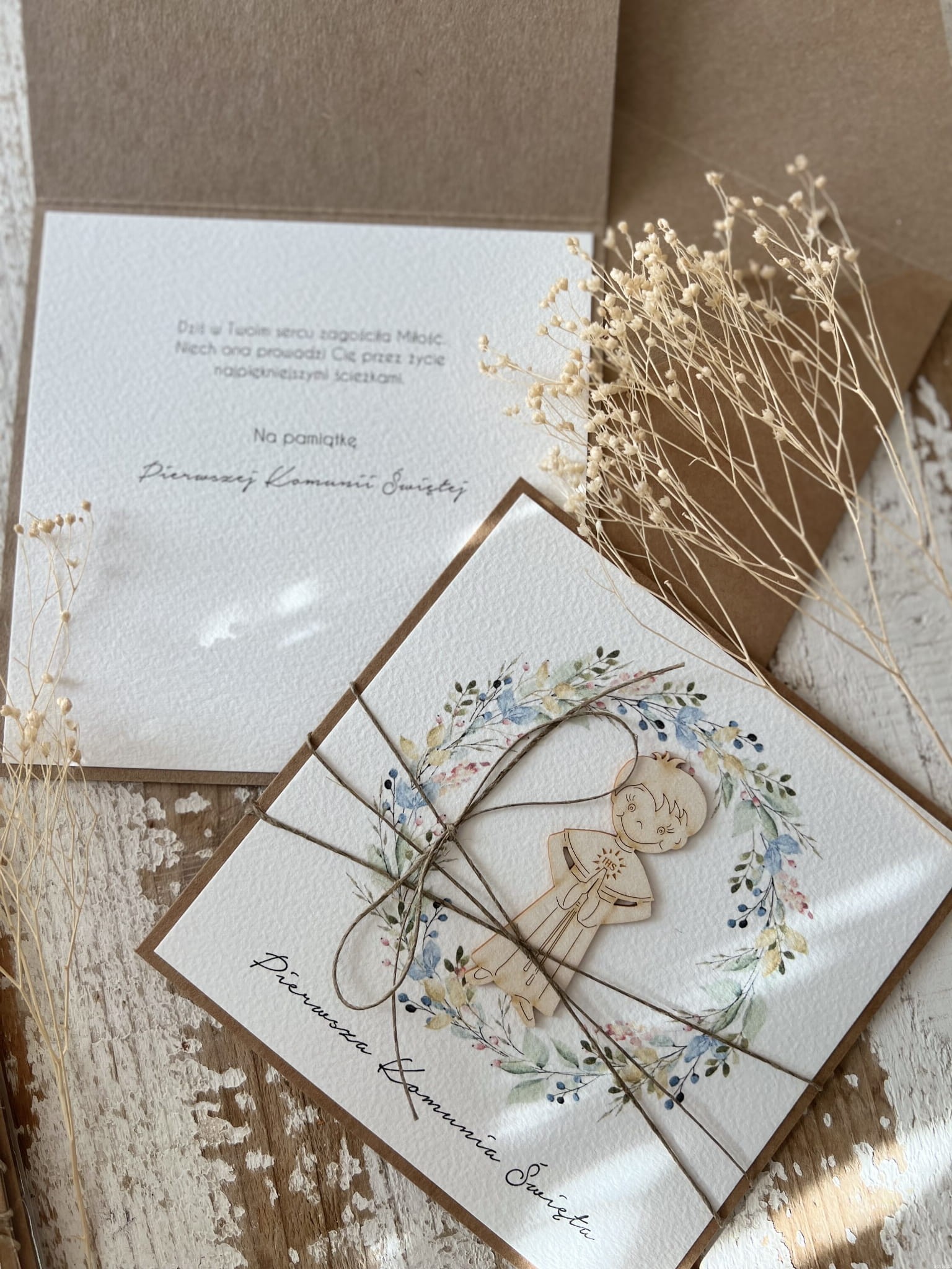 Wyjątkowa kartka na komunię wykonana jest z papieru kraftowego oraz papieru bawełnianego w odcieniu śmietanki z użyciem ozdoby tekturkowej. Kartka otwierana do góry, w środku wklejona jest kartka z papieru bawełnianego - gotowe wyjątkowe życzenia są już w środku - personalizacja możliwa za dopłatą. W zestawie z kopertą.