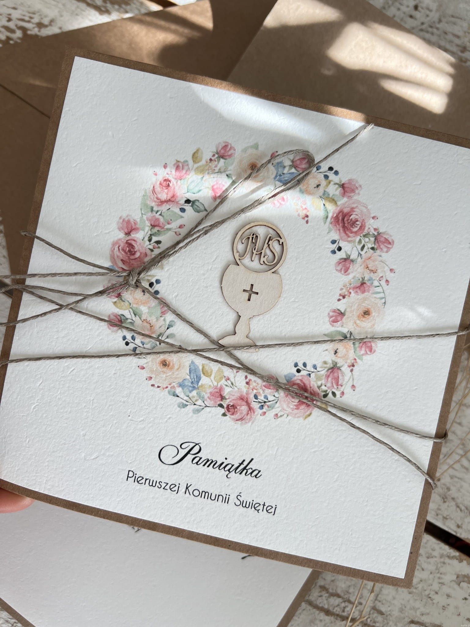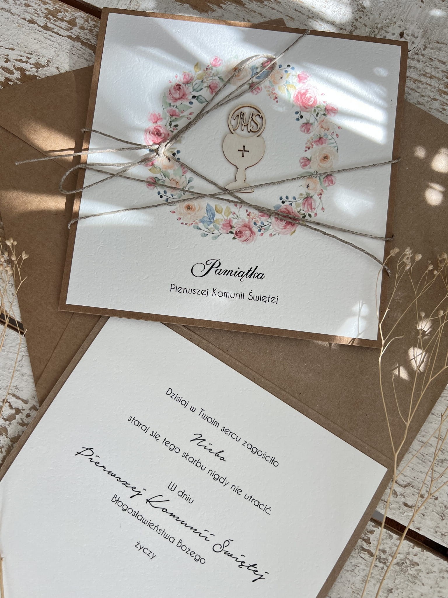 Wyjątkowa kartka na komunię wykonana jest z papieru kraftowego oraz papieru bawełnianego w odcieniu śmietanki z użyciem ozdoby tekturkowej. Kartka otwierana do góry, w środku wklejona jest kartka z papieru bawełnianego - gotowe wyjątkowe życzenia są już w środku - personalizacja możliwa za dopłatą. W zestawie z kopertą.