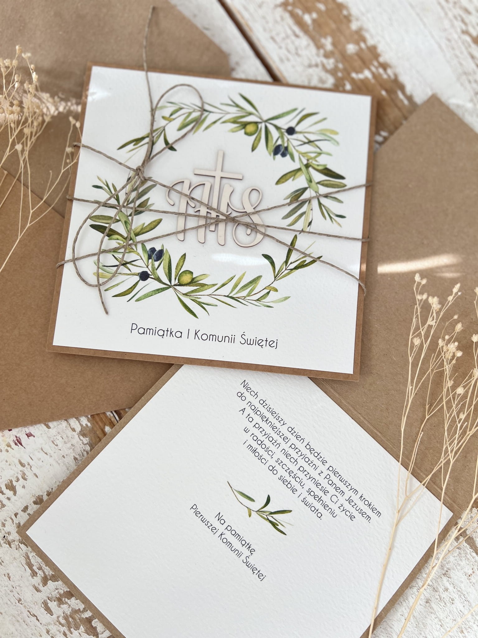 Wyjątkowa kartka na komunię wykonana jest z papieru kraftowego oraz papieru bawełnianego w odcieniu śmietanki z użyciem ozdoby tekturkowej. Kartka otwierana do góry, w środku wklejona jest kartka z papieru bawełnianego - gotowe wyjątkowe życzenia są już w środku - personalizacja możliwa za dopłatą. W zestawie z kopertą.