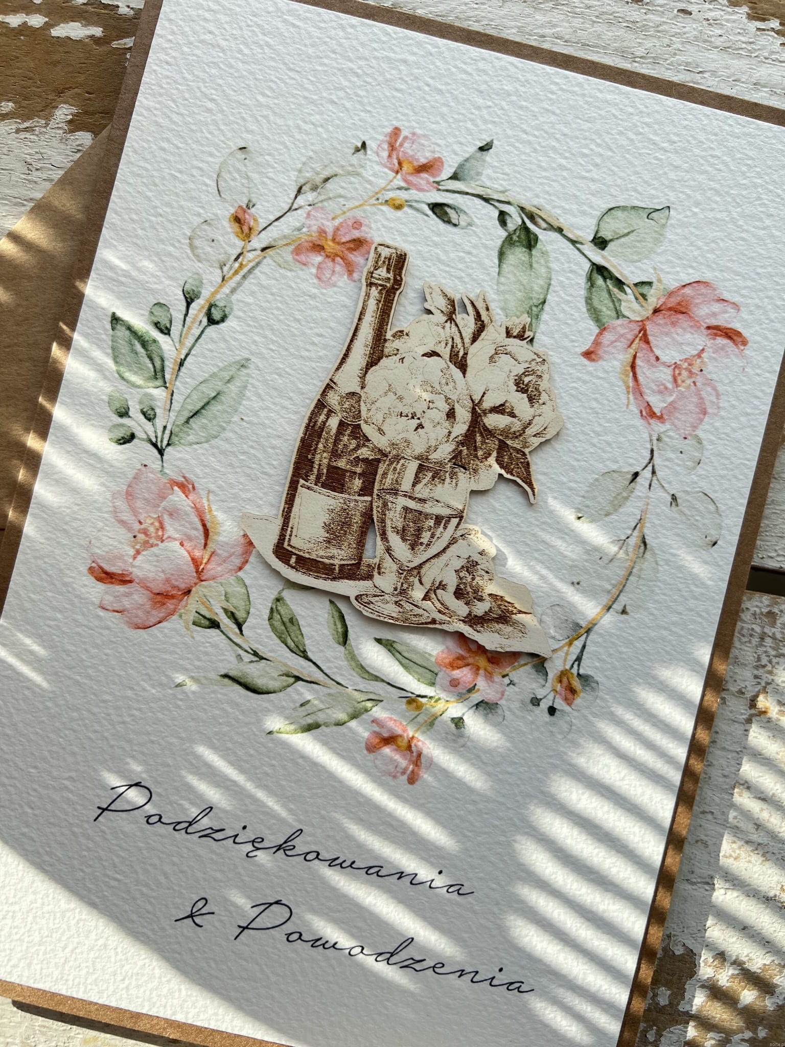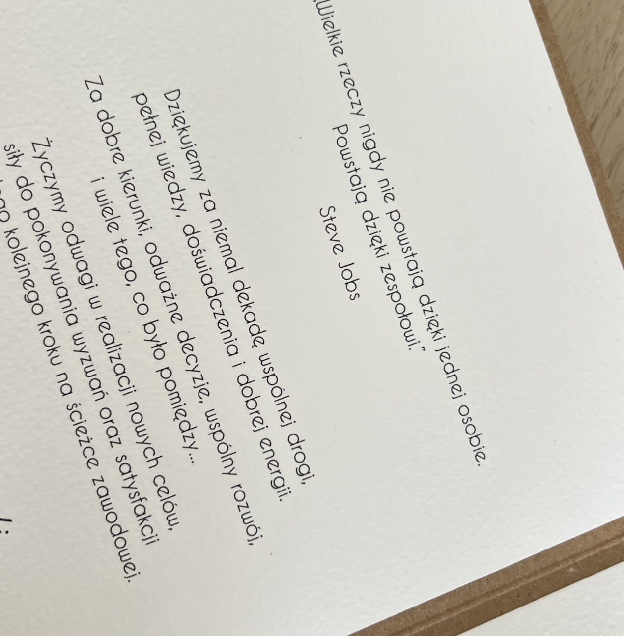 Kartka przewiązana lnianym sznureczkiem. Widoczne na zdjęciu życzenia są już wklejone do kartki.