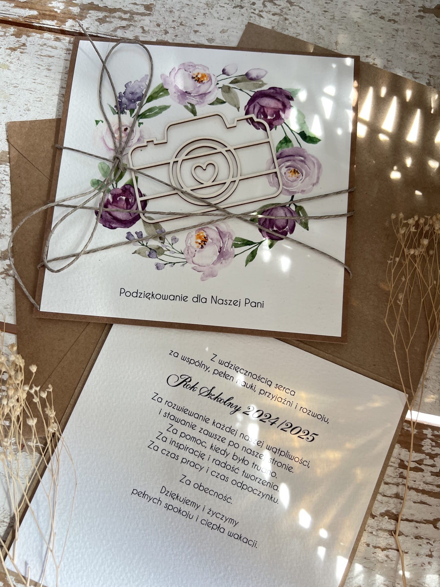 Kartka wykonana jest na bazie papieru kraftowego z użyciem starannie wyselekcjonowanego papieru bawełnianego w kolorze ecri oraz ozdoby tekturkowej. Zestaw przewiązany jest lnianym sznureczkiem.