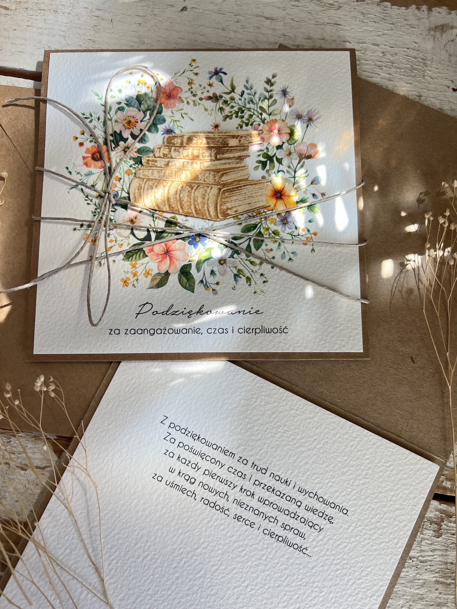 Kartka wykonana jest na bazie papieru kraftowego z użyciem starannie wyselekcjonowanego papieru bawełnianego w kolorze ecri oraz ozdoby tekturkowej. Zestaw przewiązany jest lnianym sznureczkiem.
