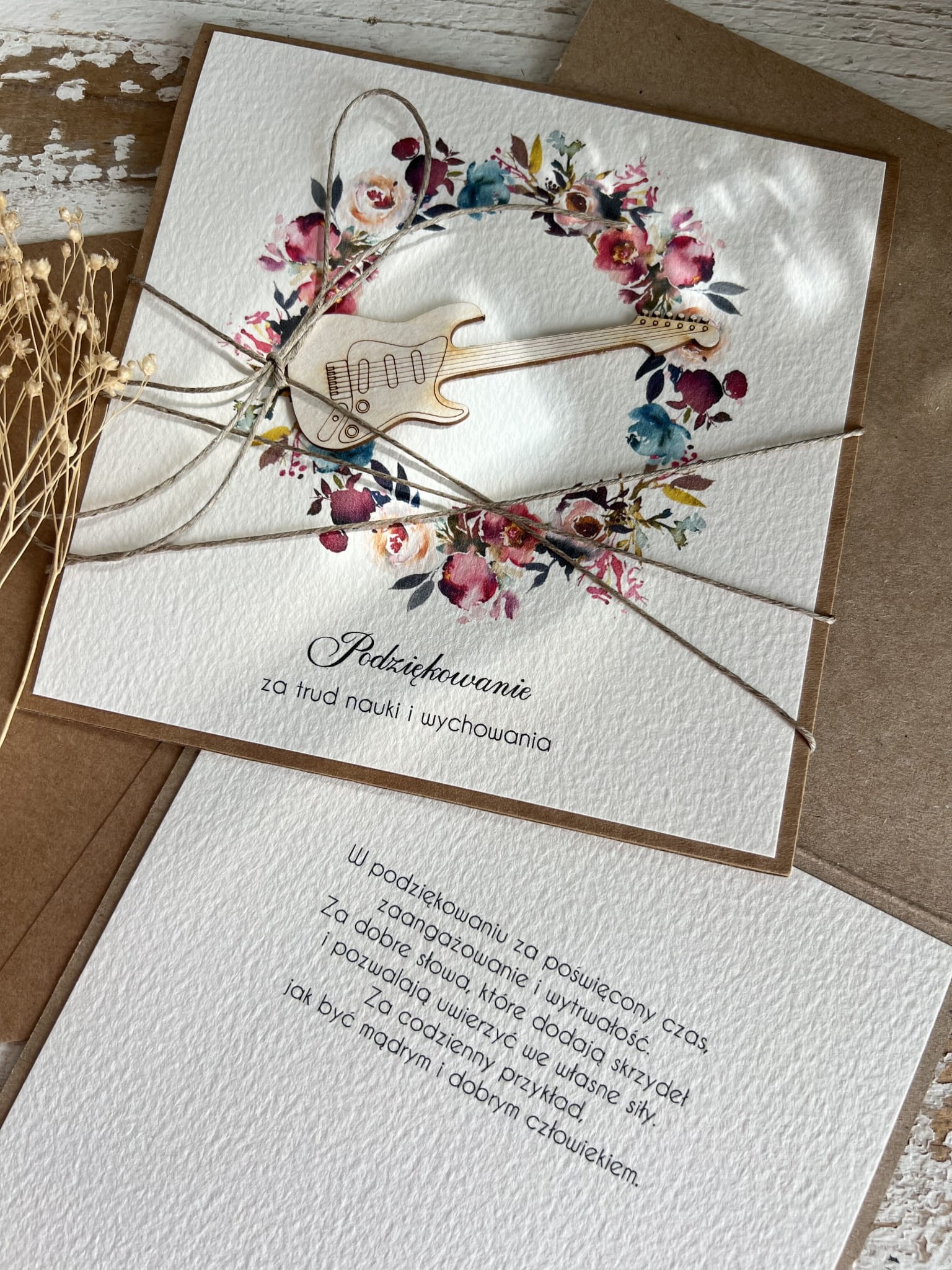Kartka wykonana jest na bazie papieru kraftowego z użyciem starannie wyselekcjonowanego papieru bawełnianego w kolorze ecri oraz ozdoby tekturkowej. Zestaw przewiązany jest lnianym sznureczkiem.