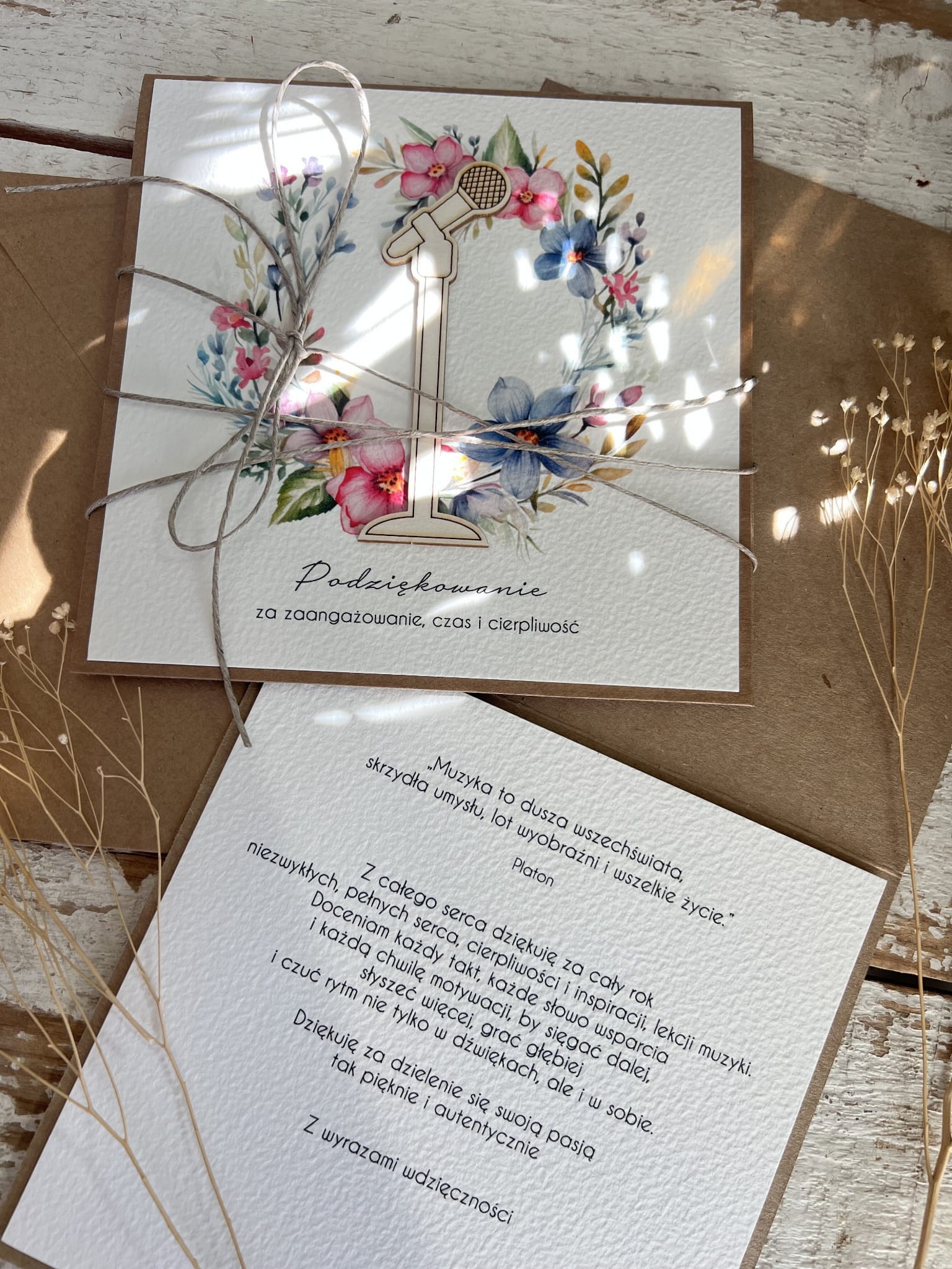 Kartka wykonana jest na bazie papieru kraftowego z użyciem starannie wyselekcjonowanego papieru bawełnianego w kolorze ecri oraz ozdoby tekturkowej. Zestaw przewiązany jest lnianym sznureczkiem.
