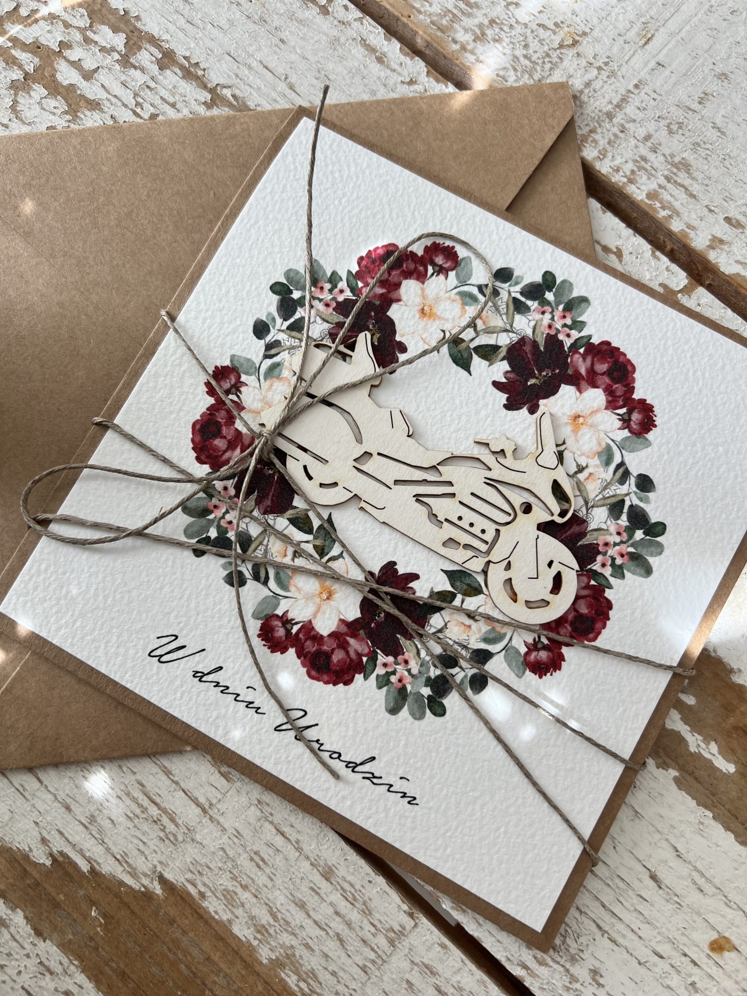 Kartka wykonana jest na bazie papieru kraftowego z użyciem starannie wyselekcjonowanego papieru bawełnianego w odcieniu śmietanki oraz ozdoby tekturkowej. Kartka przewiązana jest lnianym sznureczkiem.