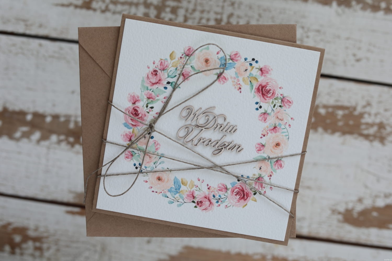 Kartka wykonana jest na bazie papieru kraftowego z użyciem starannie wyselekcjonowanego papieru bawełnianego w odcieniu śmietanki oraz ozdoby tekturkowej. Kartka przewiązana jest lnianym sznureczkiem.