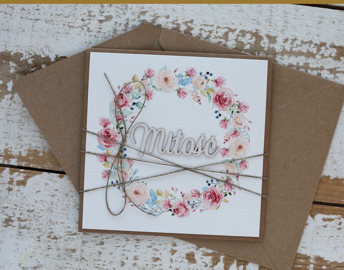 Kartka ślubna wykonana jest na bazie papieru kraftowego z użyciem starannie wyselekcjonowanego papieru bawełnianego w kolorze ecri oraz ozdoby tekturkowej. Kartka przewiązana jest lnianym sznureczkiem.