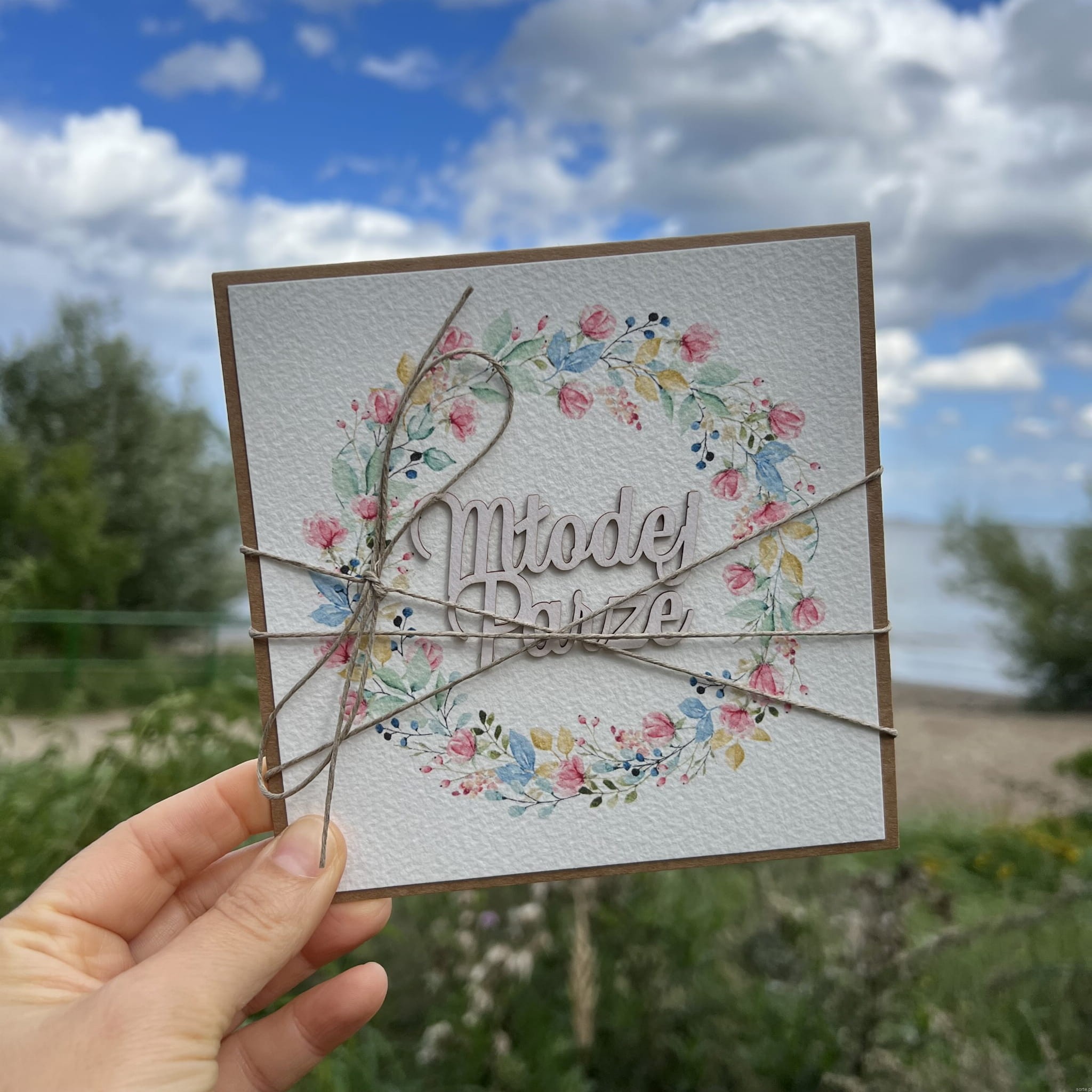 Kartka ślubna wykonana jest na bazie papieru kraftowego z użyciem starannie wyselekcjonowanego papieru bawełnianego w kolorze ecri oraz ozdoby tekturkowej. Kartka przewiązana jest lnianym sznureczkiem.