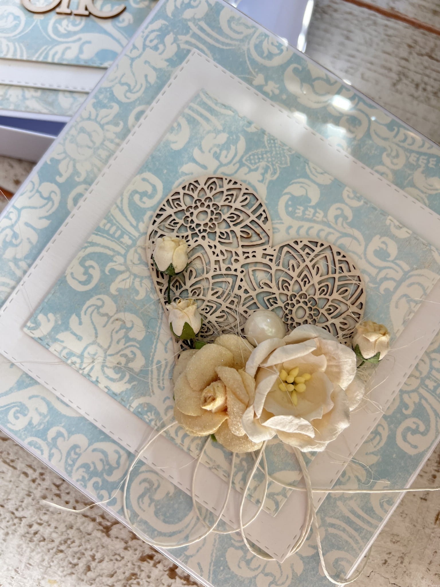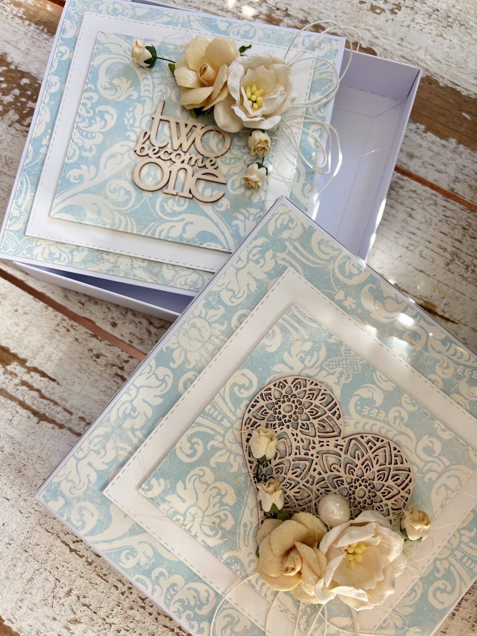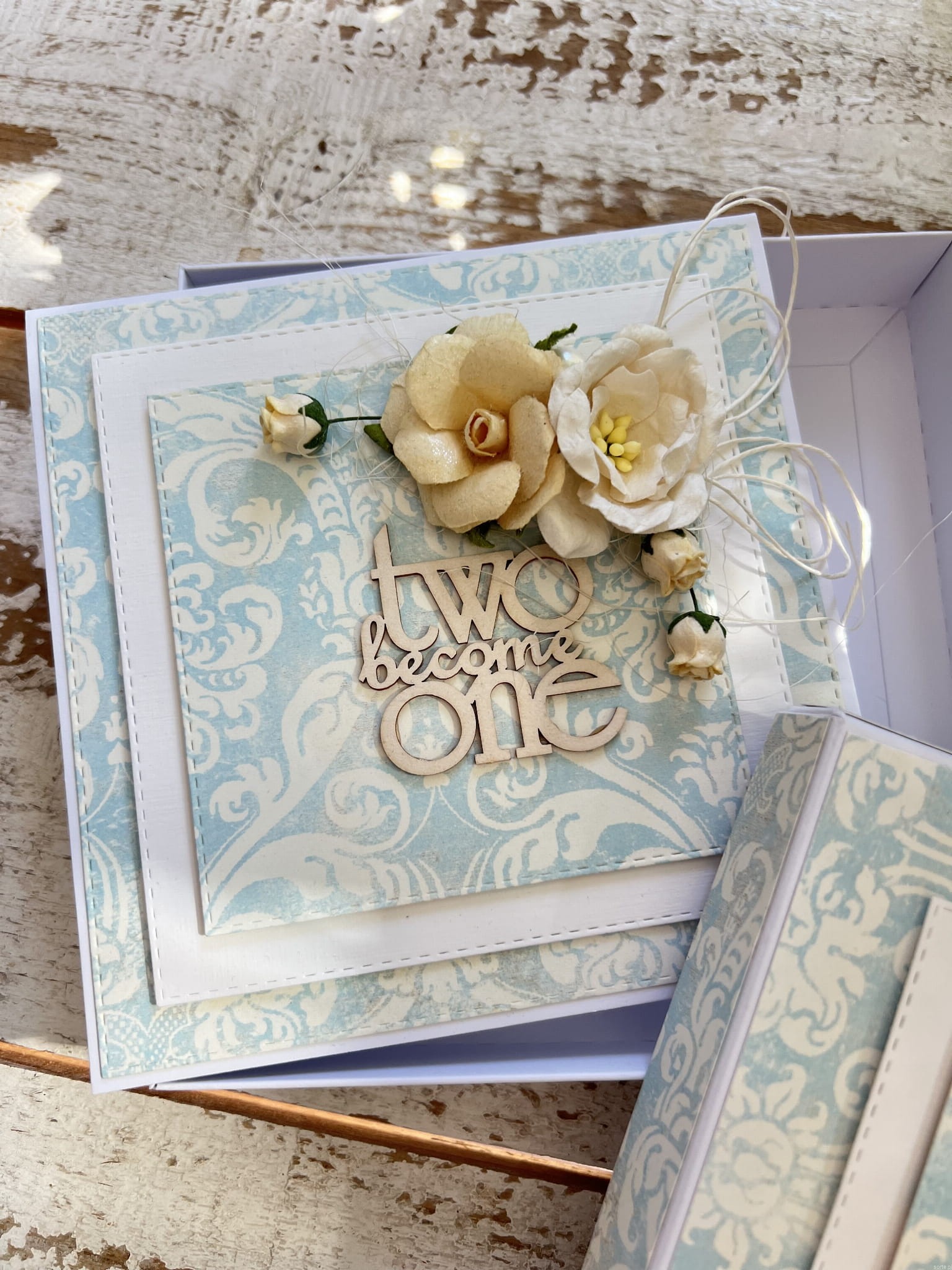Kartka ślubna o wymiarach 14x14 cm otwierana do góry wraz z pudełkiem.