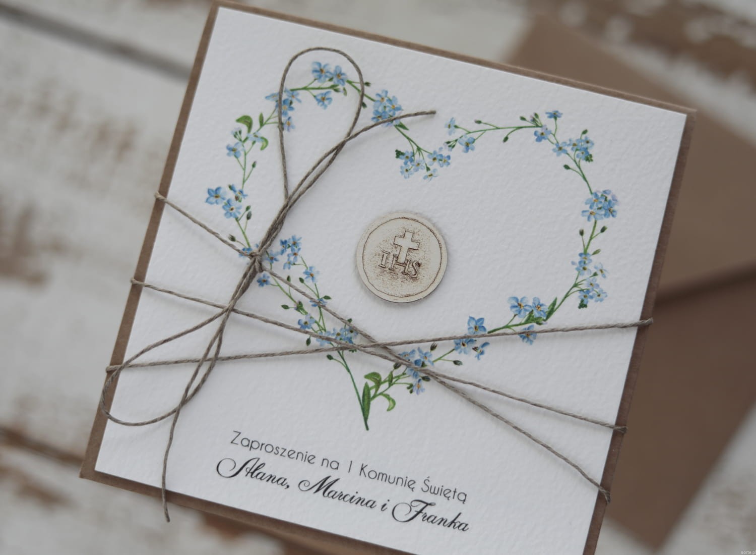 Najpiękniejsze ręcznie robione zaproszenia na komunię z personalizacją dla chłopca, dla dziewczynki serce z niezapominajkami