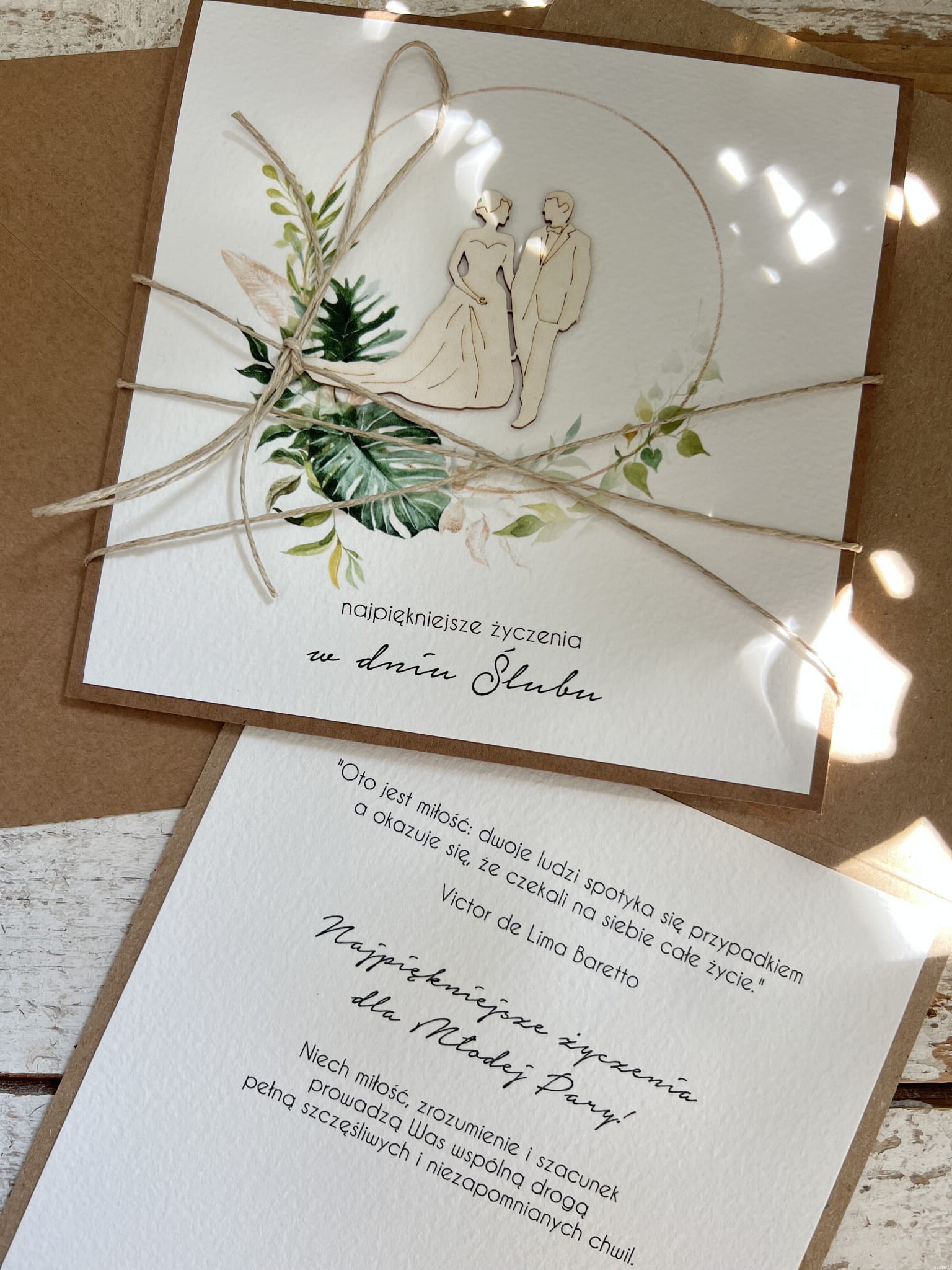 Oryginalna kartka ślubna Młoda Para w wianku monstera