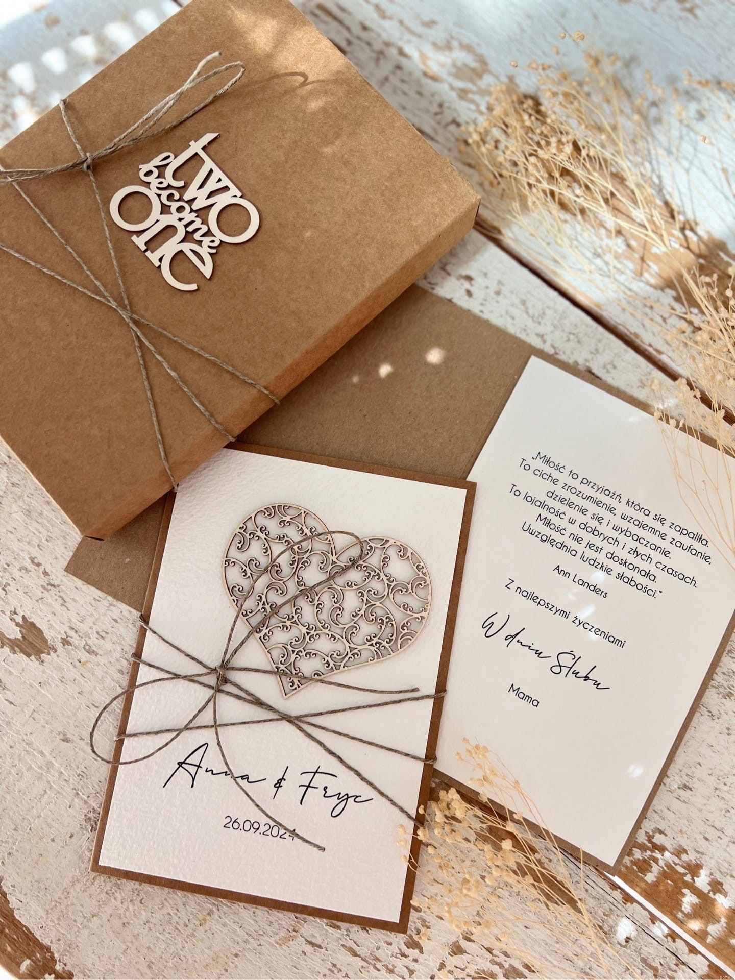 Kartka ślubna oraz pudełko przewiązane są lnianym sznureczkiem.