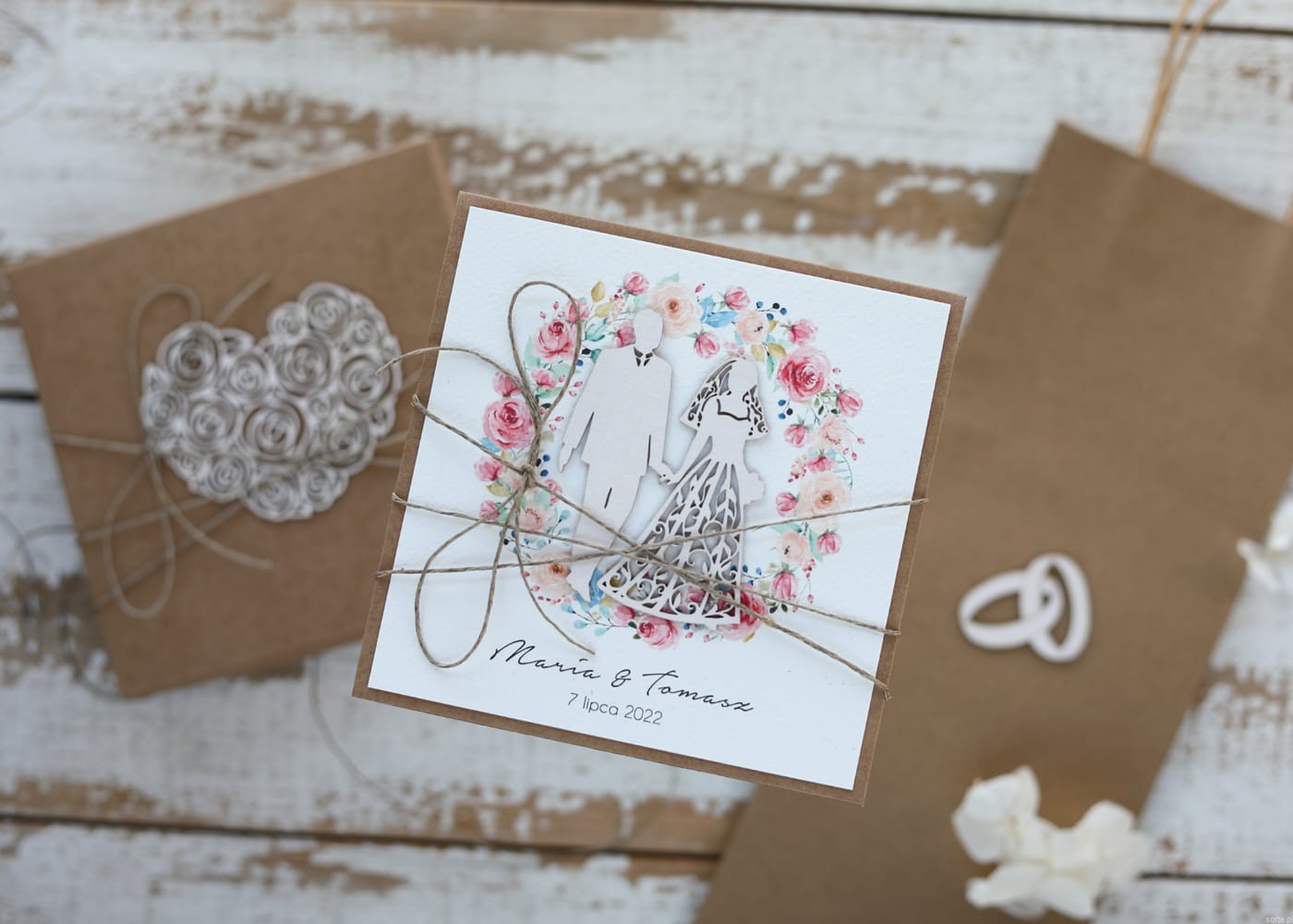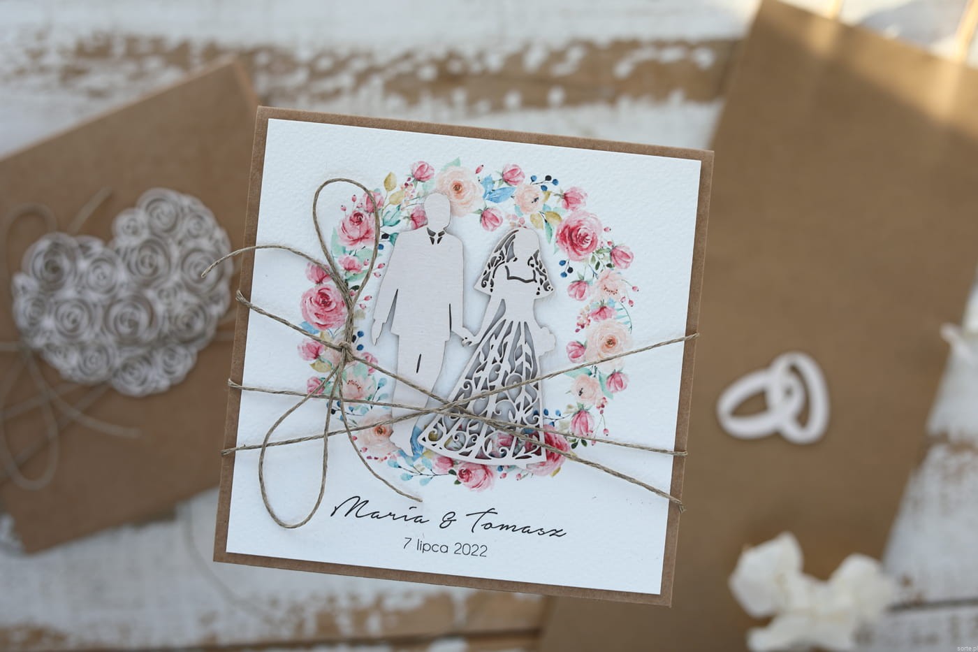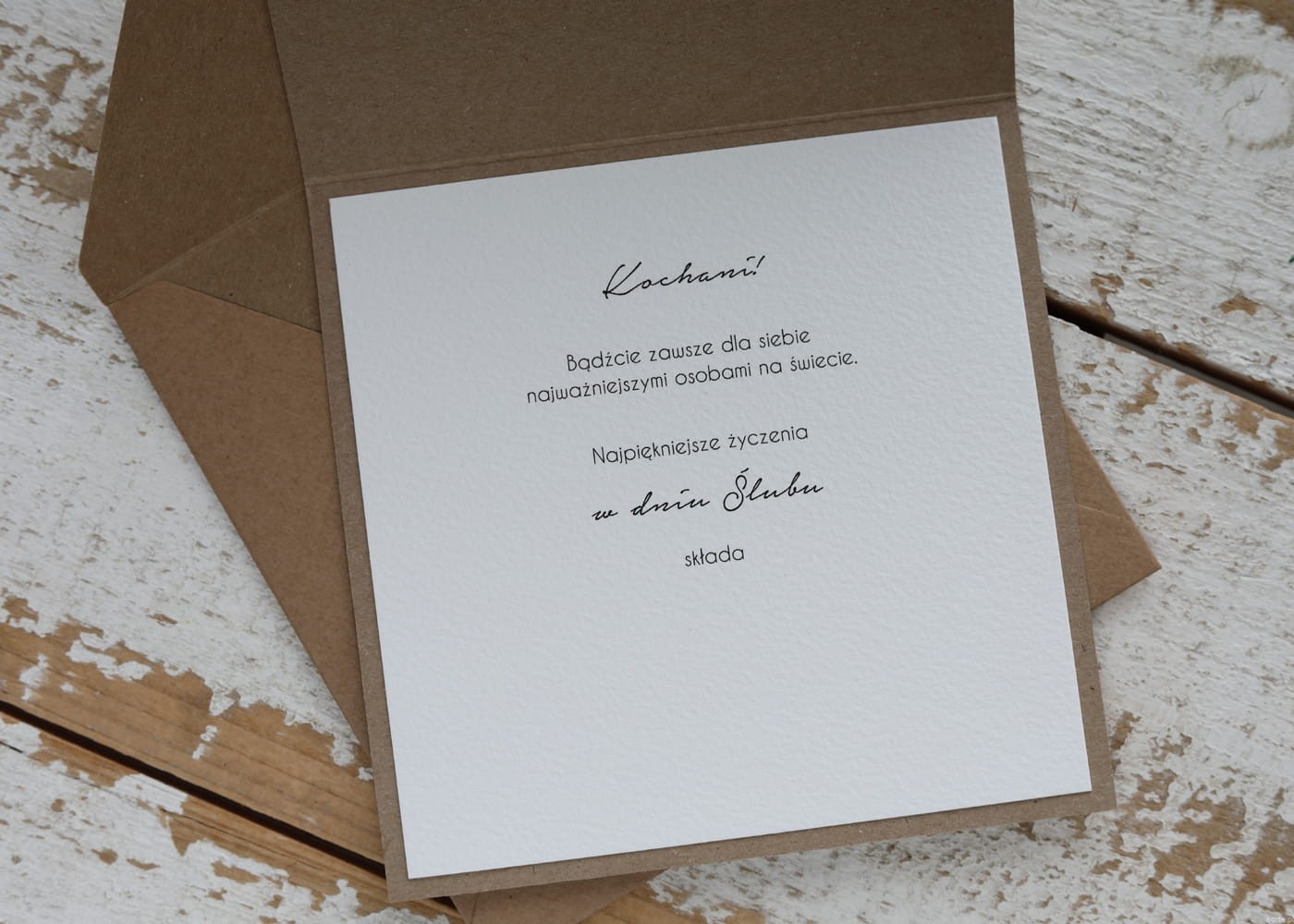 Kartka na ślub o wymiarach ok. 14x14 cm wykonana jest z papieru kraftowego oraz papieru bawełnianego z użyciem ozdoby tekturkowej. Kartka otwierana do góry, w środku wklejona jest kartka z papieru bawełnianego z życzeniami bądź gotowa do wpisania życzeń własnoręcznie.