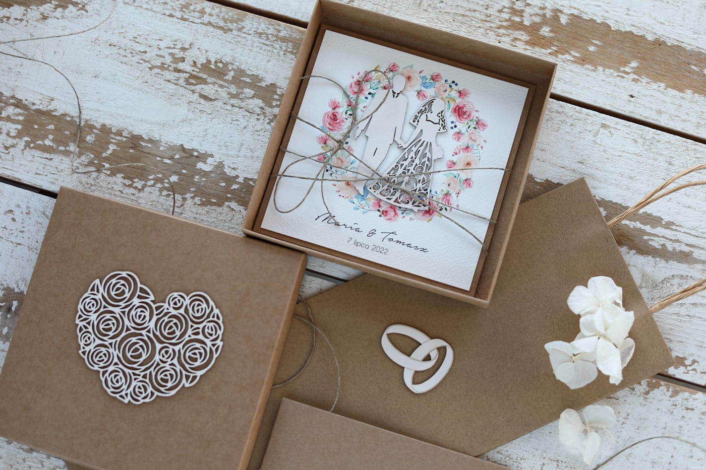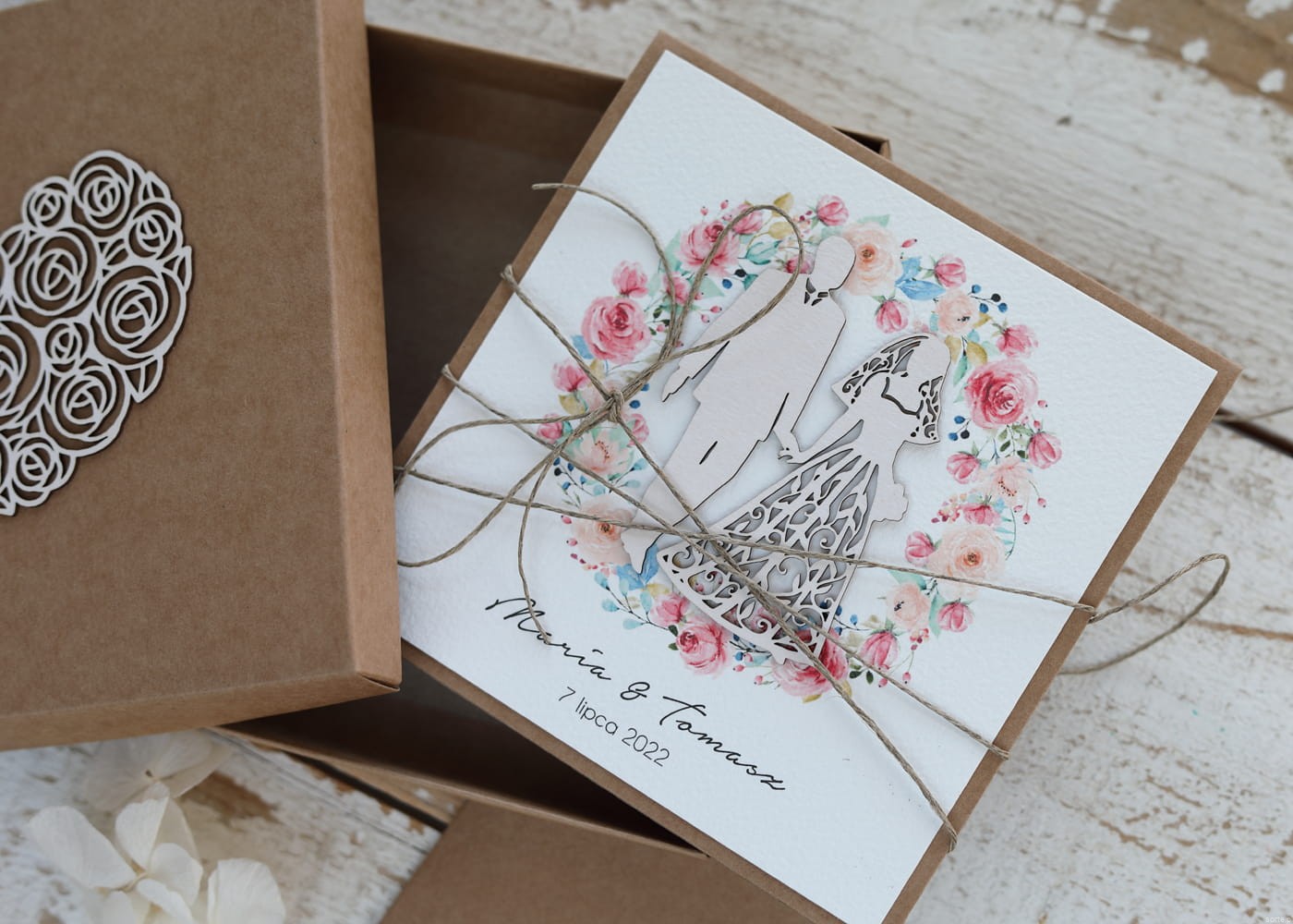Oryginalna kartka ślubna z pudełkiem z wiankiem boho, pomysł na prezent ślubny, koperta na pieniądze