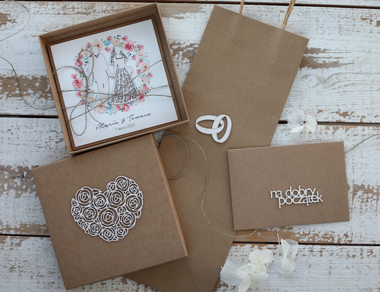 Kartka oraz pudełko przewiązane są lnianym sznureczkiem.