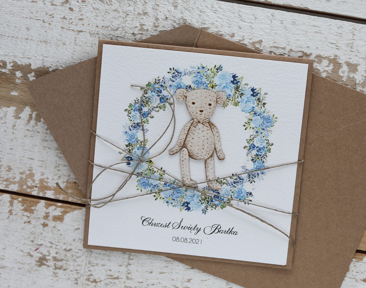 Rustykalna kartka na chrzest handmade wykonana na bazie papieru kraftowego z użyciem starannie wyselekcjonowanego papieru bawełnianego w kolorze ecri oraz tekturkowej ozdoby. Kartka otwierana jest do góry. Kartka przewiązana jest lnianym sznureczkiem.