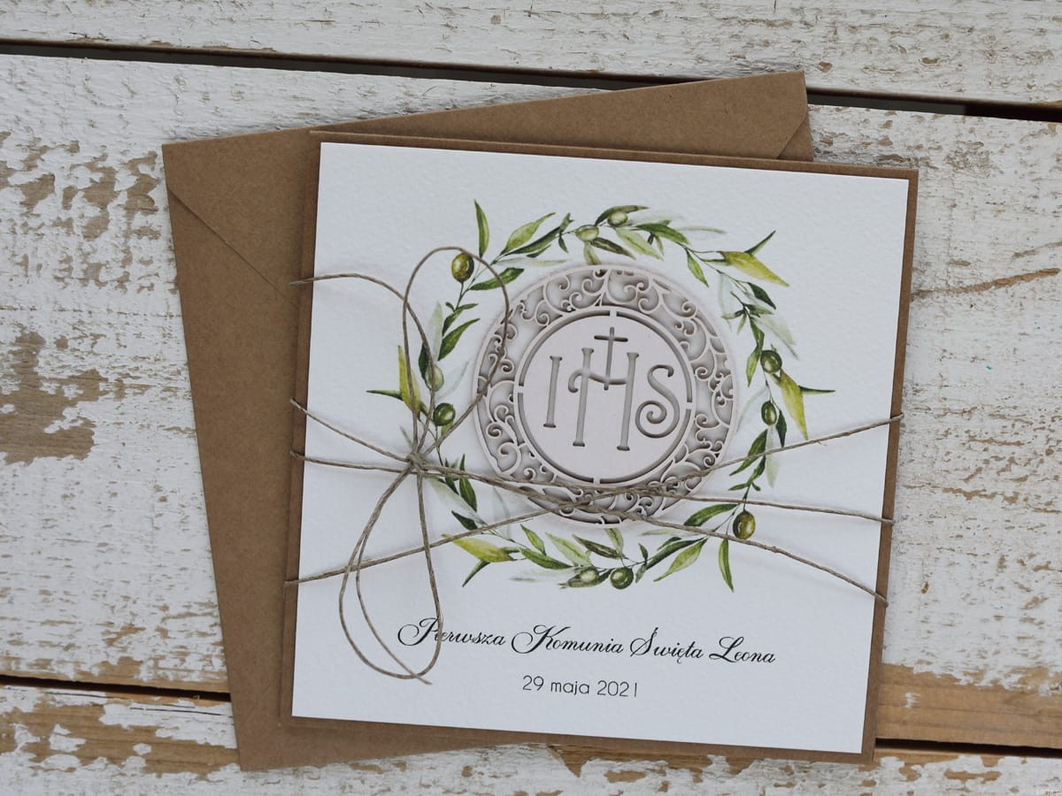 Rustykalna kartka na komunię handmade wykonana na bazie papieru kraftowego z użyciem starannie wyselekcjonowanego papieru bawełnianego w kolorze ecri oraz tekturkowej ozdoby. Kartka otwierana jest do góry. Przewiązana jest lnianym sznureczkiem. W zestawie brązowa koperta.