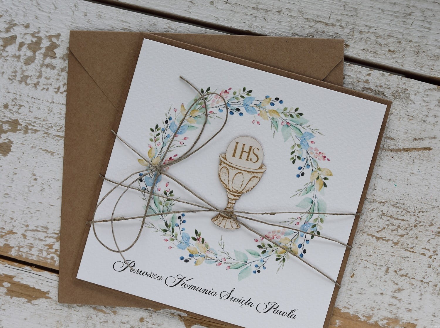Rustykalna kartka na komunię handmade wykonana na bazie papieru kraftowego z użyciem starannie wyselekcjonowanego papieru bawełnianego w kolorze ecri oraz tekturkowej ozdoby. Kartka otwierana jest do góry. Przewiązana jest lnianym sznureczkiem. W zestawie brązowa koperta.