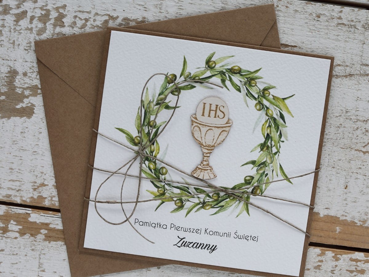 Oryginalna ręcznie robiona kartka komunijna z personalizacją i życzeniami
