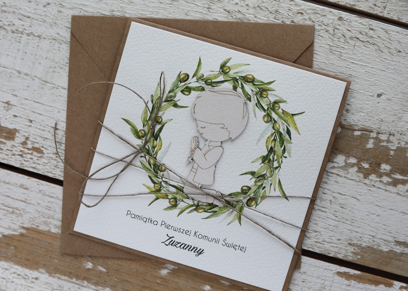 Oryginalna ręcznie robiona kartka na komunię z personalizacją i życzeniami