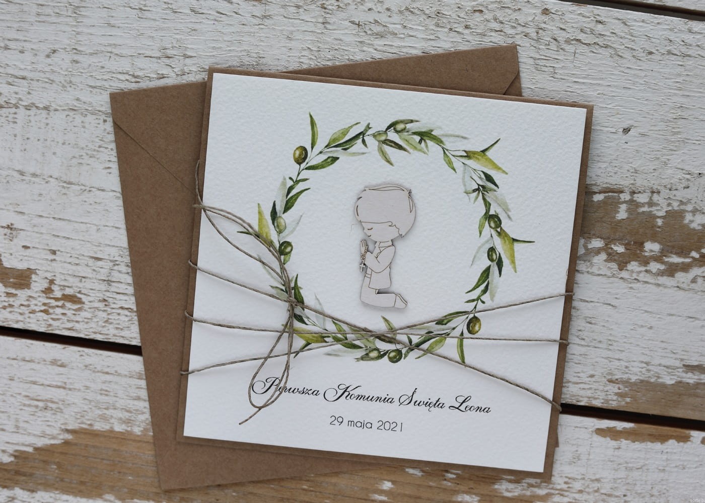Rustykalna kartka na komunię handmade wykonana na bazie papieru kraftowego z użyciem starannie wyselekcjonowanego papieru bawełnianego w kolorze ecri oraz tekturkowej ozdoby. Kartka otwierana jest do góry. Przewiązana jest lnianym sznureczkiem. W zestawie brązowa koperta.