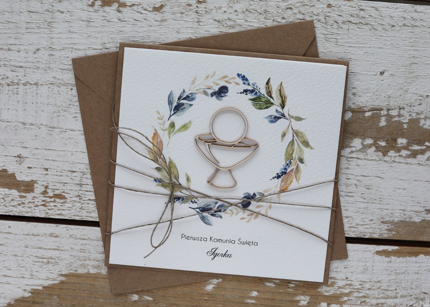 Oryginalna ręcznie robiona kartka na komunię z personalizacją i życzeniami