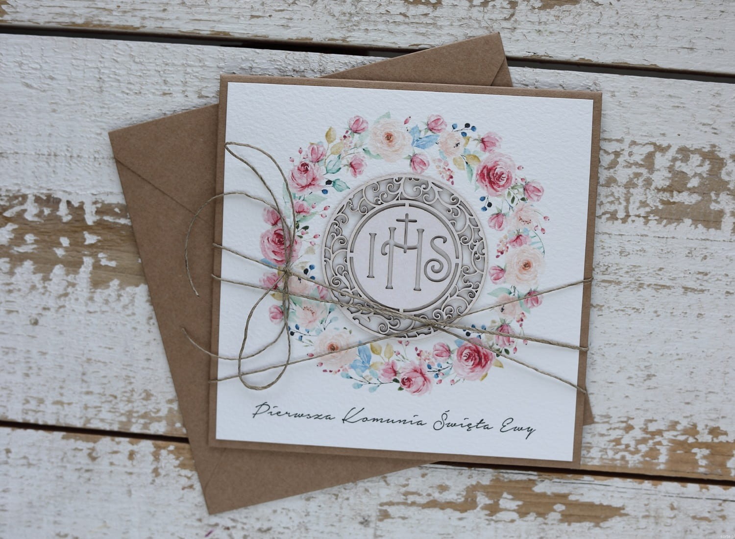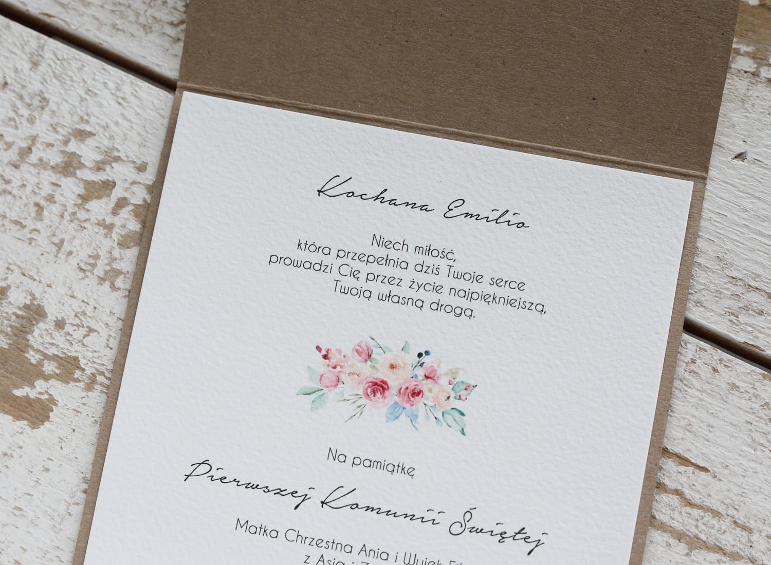 Oryginalna ręcznie robiona kartka na komunię z personalizacją i życzeniami