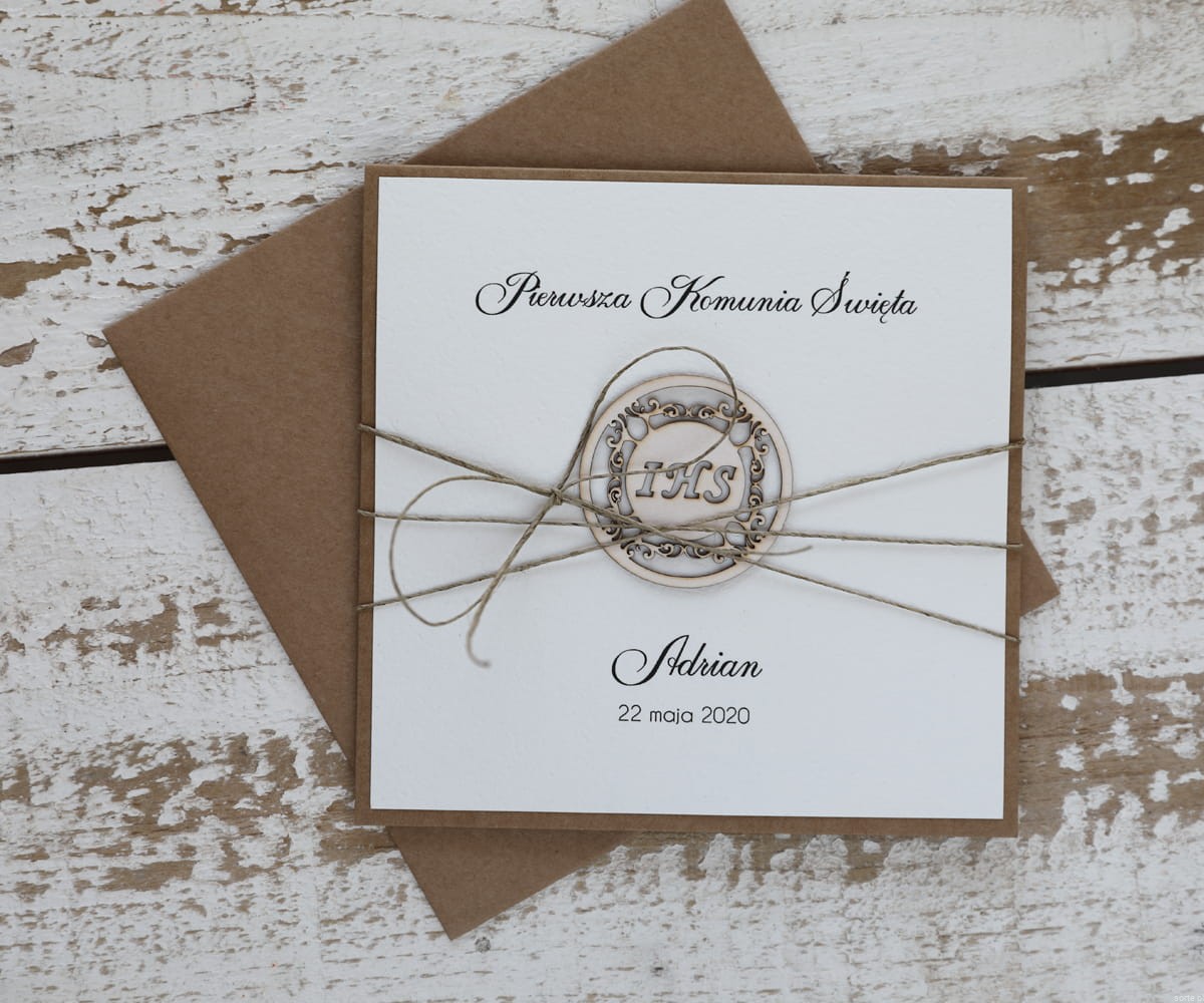 Ręcznie robiona kartka komunijna z personalizacją i życzeniami.