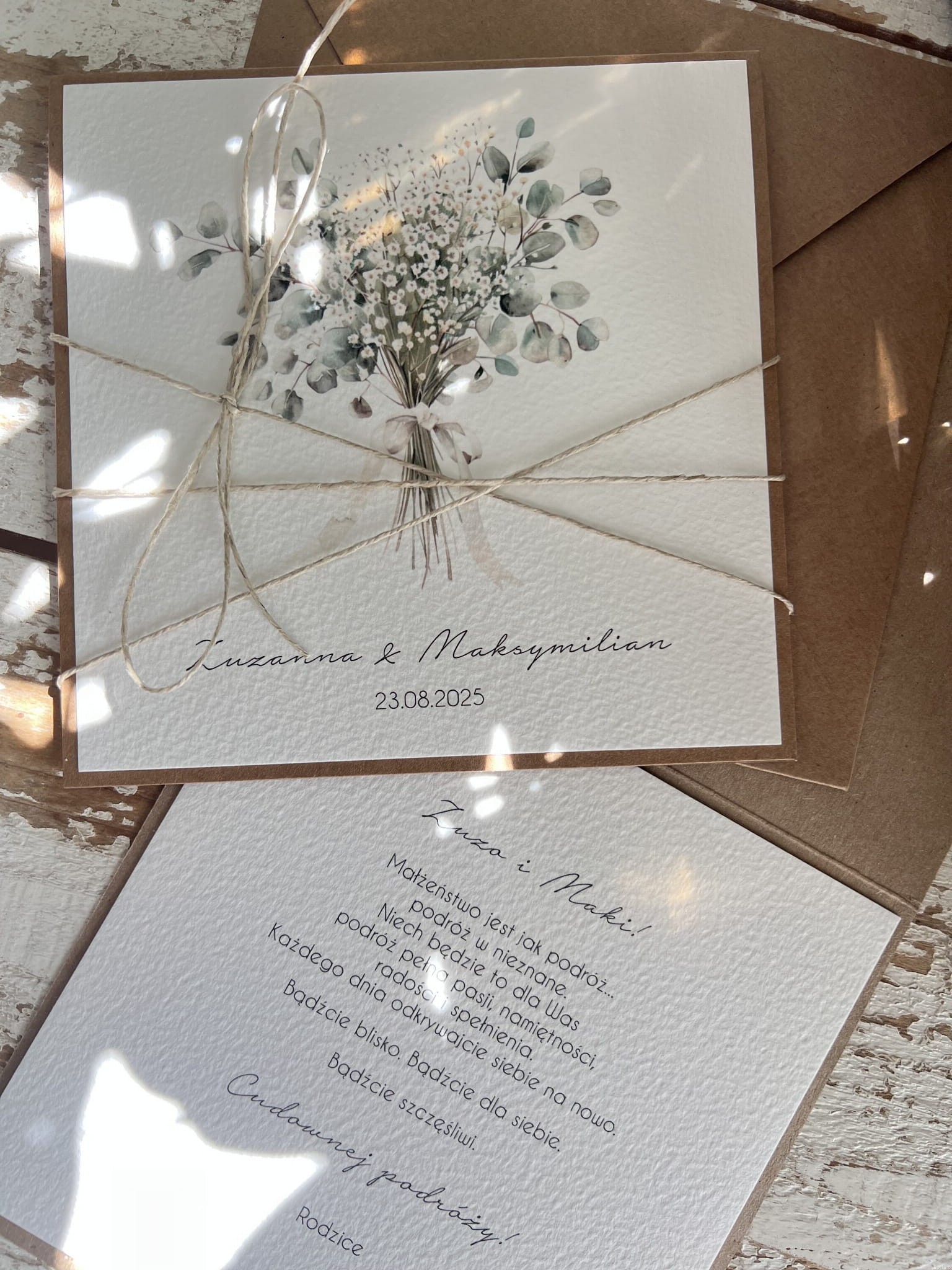 Kartka ślubna wykonana jest na bazie papieru kraftowego z użyciem starannie wyselekcjonowanego papieru bawełnianego w kolorze ecri z nadrukiem. Kartka przewiązana jest lnianym sznureczkiem.