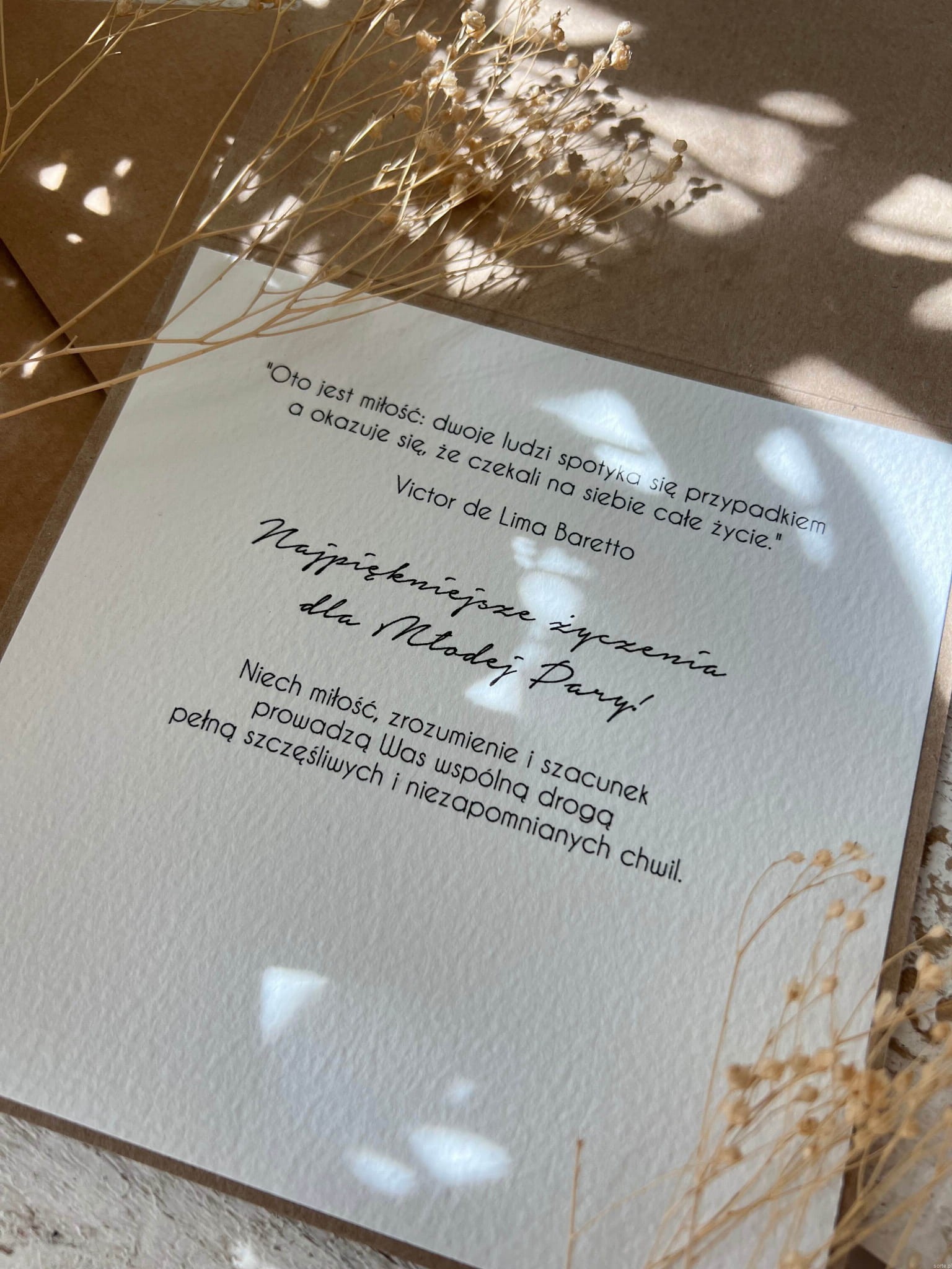 Kartka ślubna wykonana jest na bazie papieru kraftowego z użyciem starannie wyselekcjonowanego papieru bawełnianego w kolorze ecri z nadrukiem. Kartka przewiązana jest lnianym sznureczkiem.