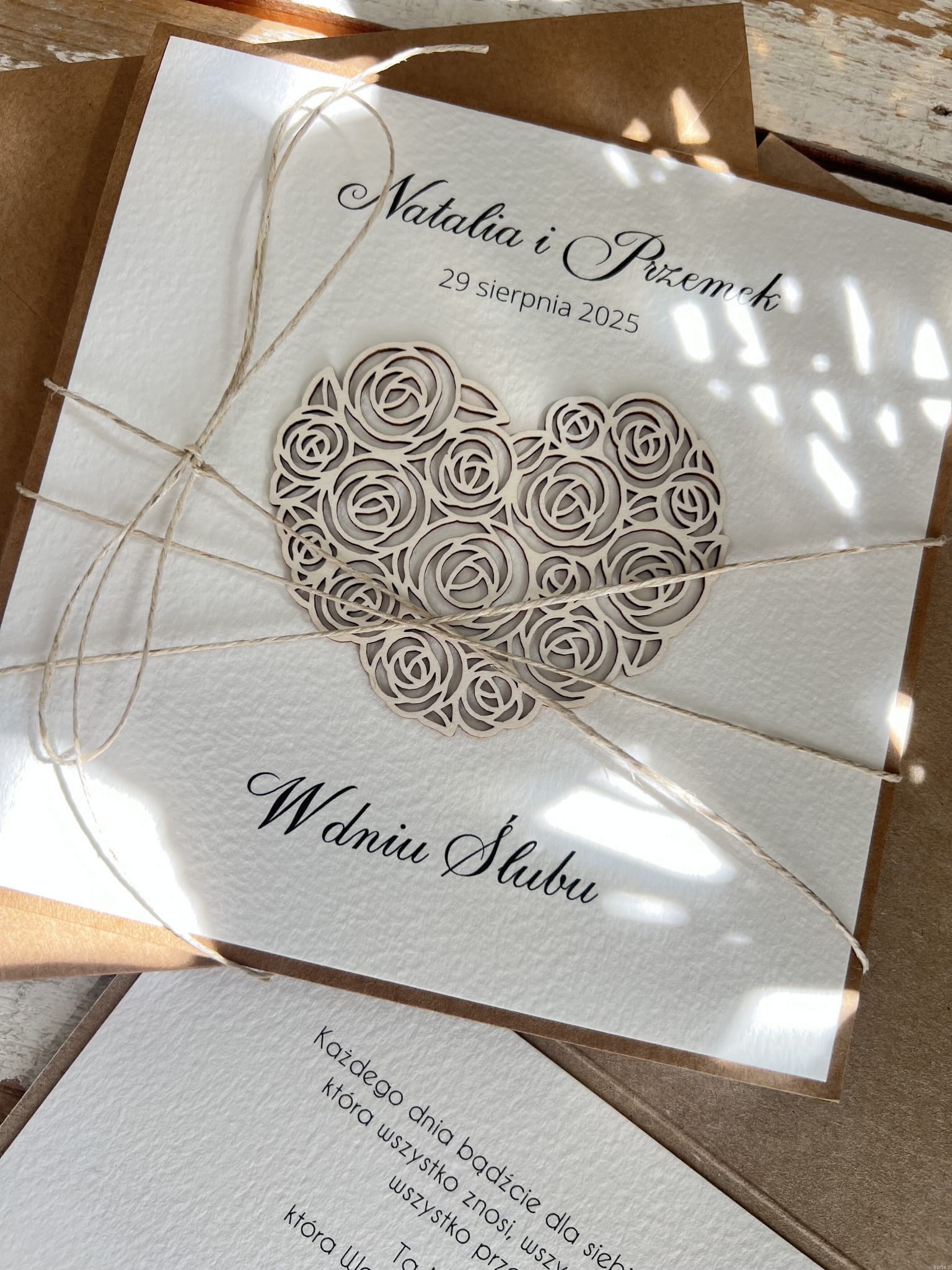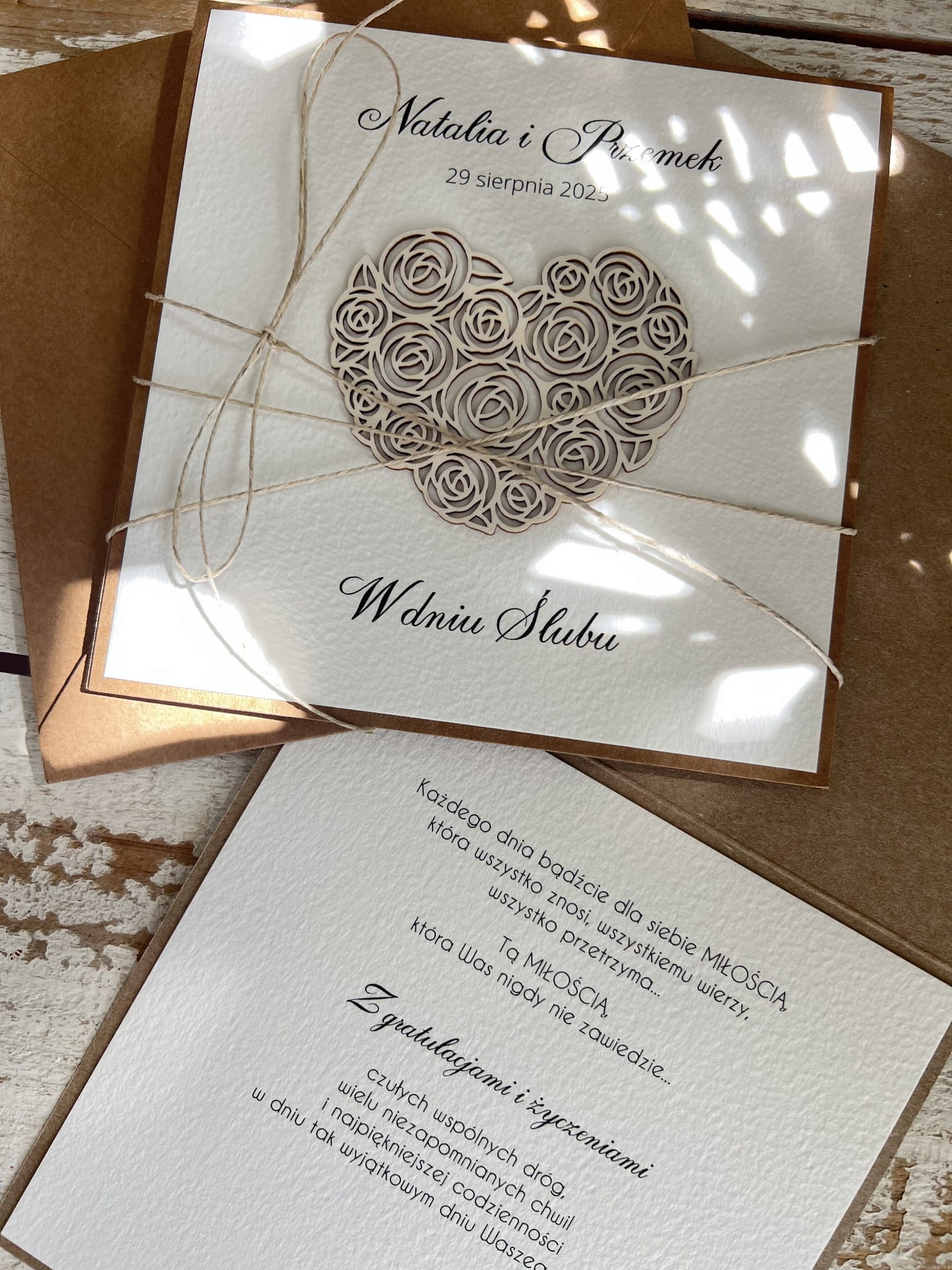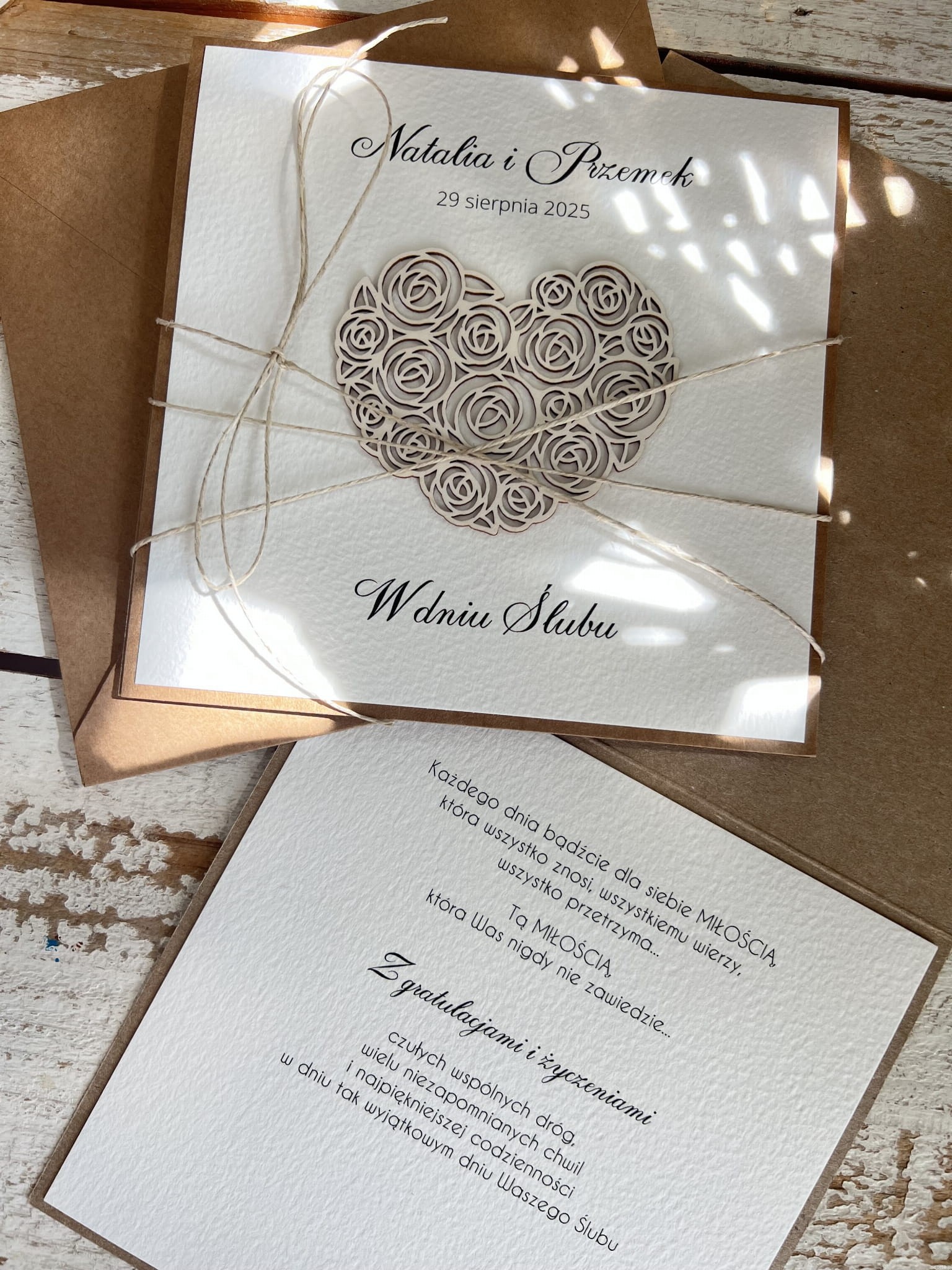 Kartka ślubna przewiązana są lnianym sznureczkiem w zestawie z kopertą.