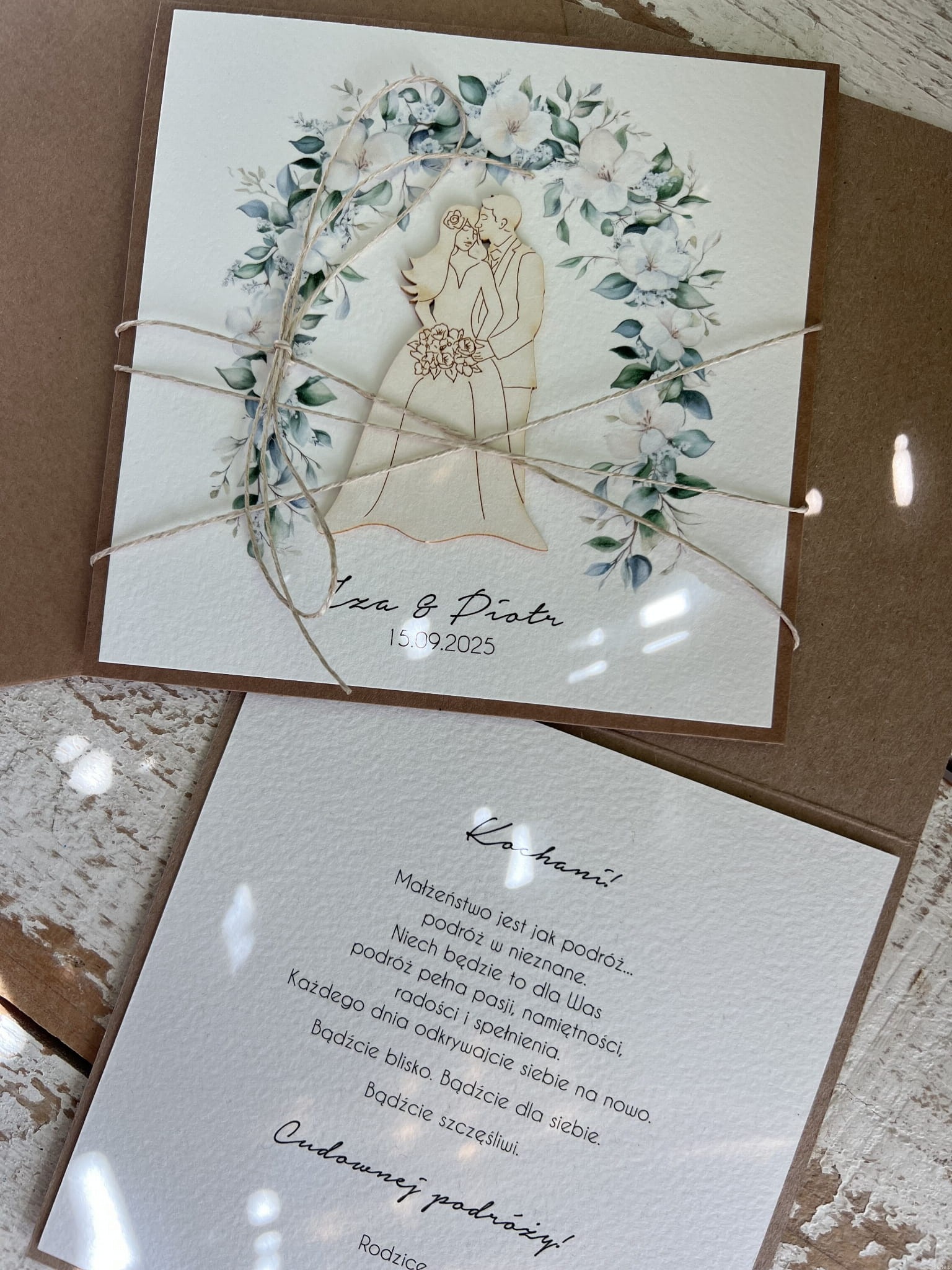 Kartka ślubna przewiązana są lnianym sznureczkiem w zestawie z kopertą.