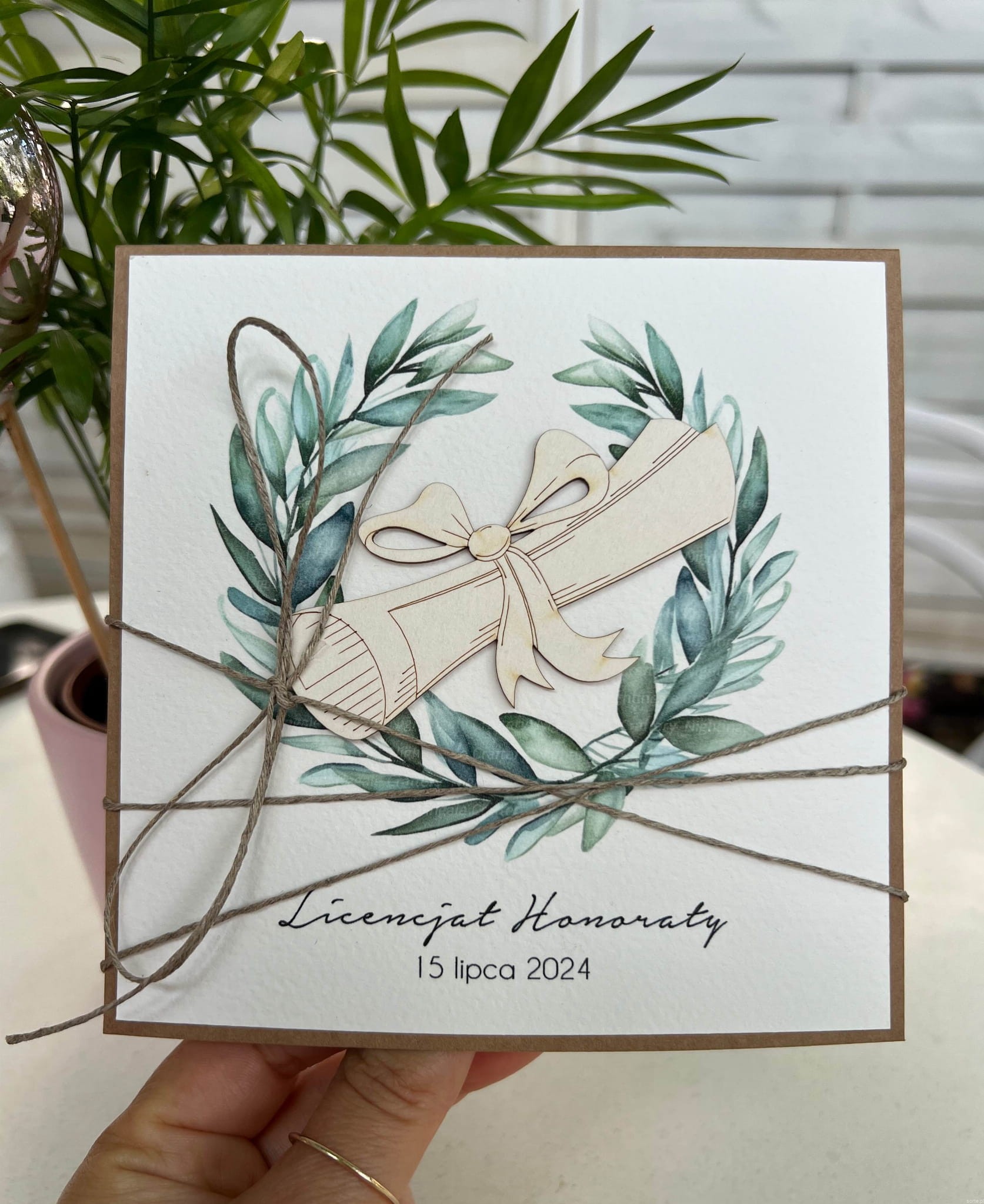 Personalizowana ręcznie robiona kartka gratulacje z okazji uzyskania absolutorium obrony pracy licencjackiej, magisterskiej, doktorskiej