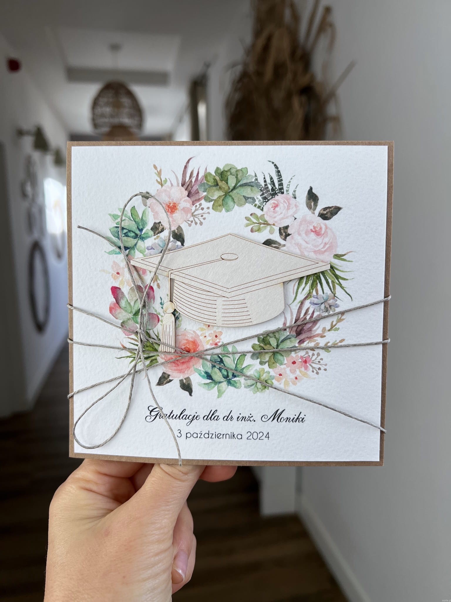 Personalizowana ręcznie robiona kartka gratulacje z okazji uzyskania absolutorium obrony pracy licencjackiej, magisterskiej, doktorskiej