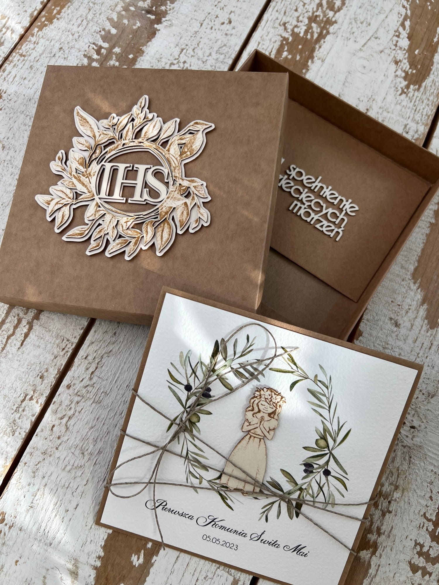 Wymiary: kartka 14x14cm otwierana do góry, przewiązana lnianym sznureczkiem w zestawie z pudełkiem oraz kopertą na pieniądze.