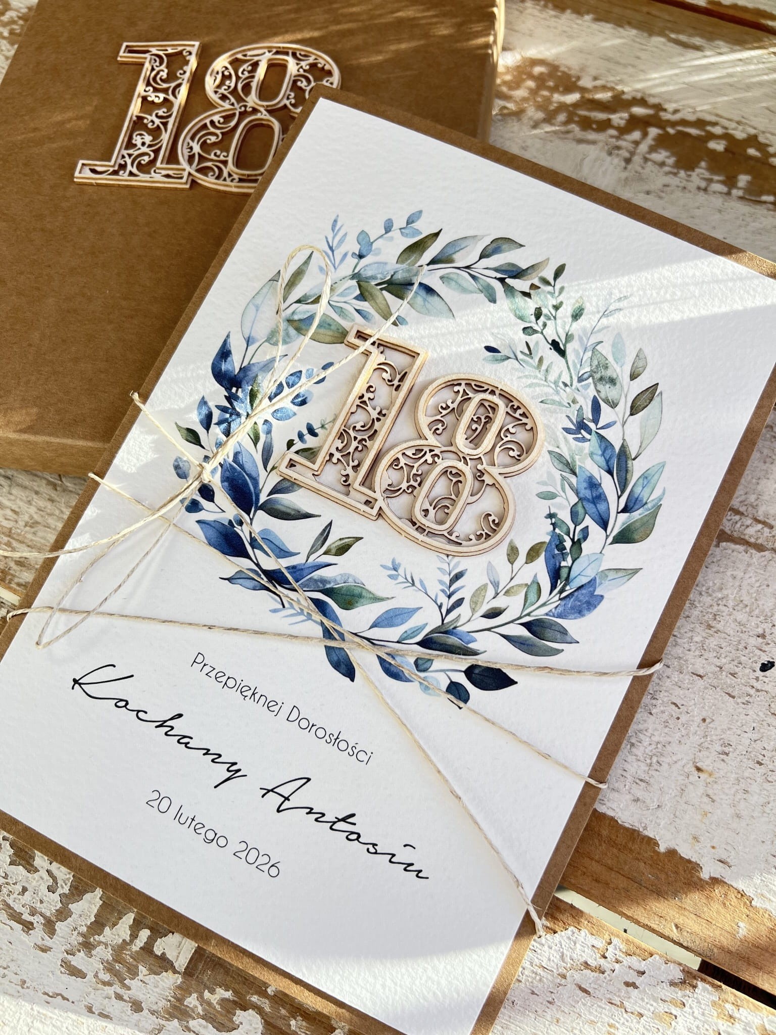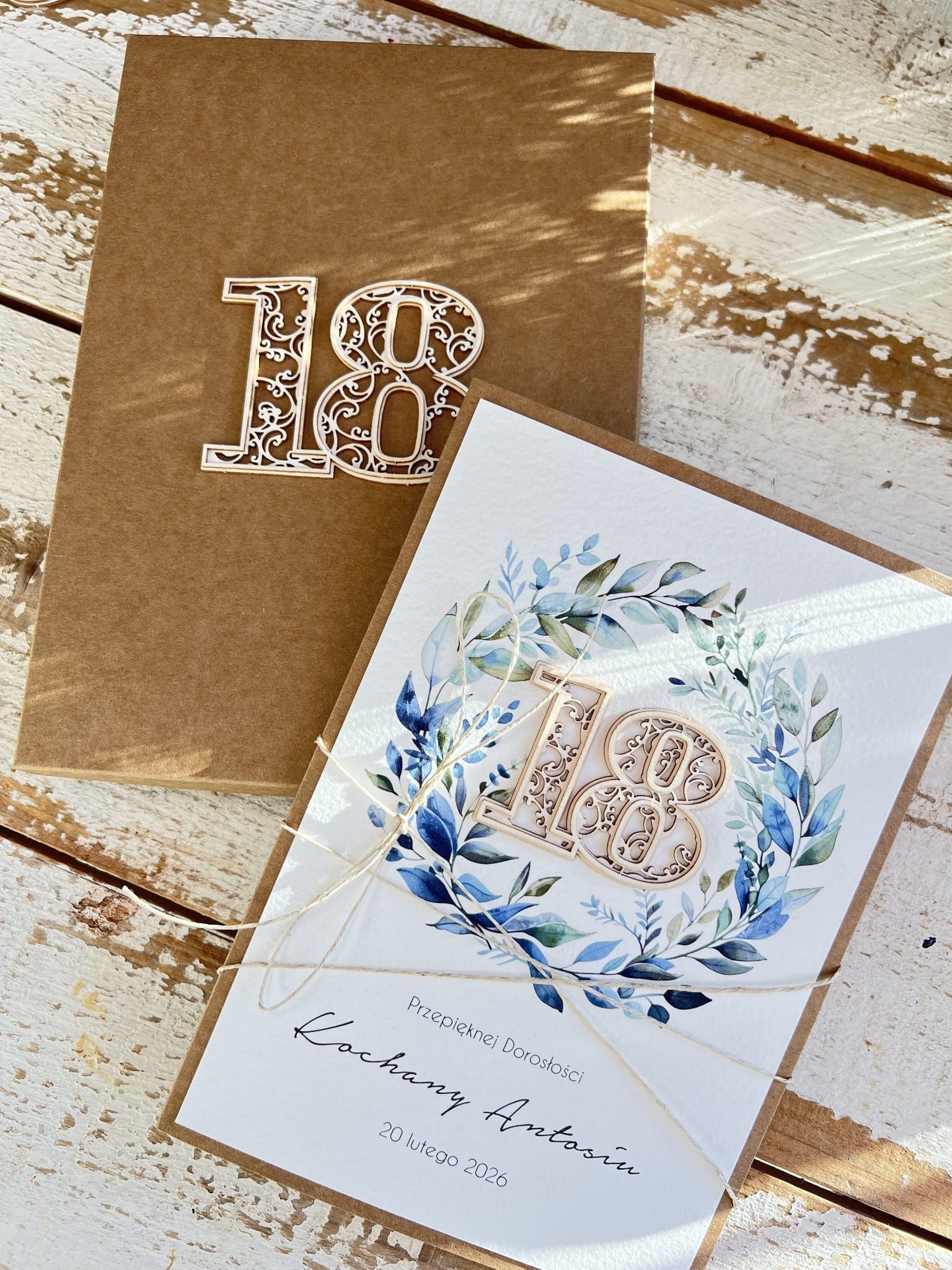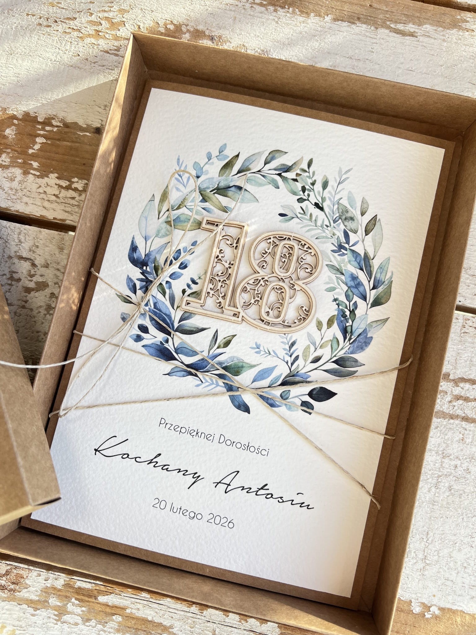 Personalizowany prezent - kartka ręcznie robiona z wiankiem na 18 urodziny, osiemnastka z personalizacją + personalizowane najpiękniejsze życzenia urodzinowe A5 w pudełku prezent od matki chrzestnej, rodziców
