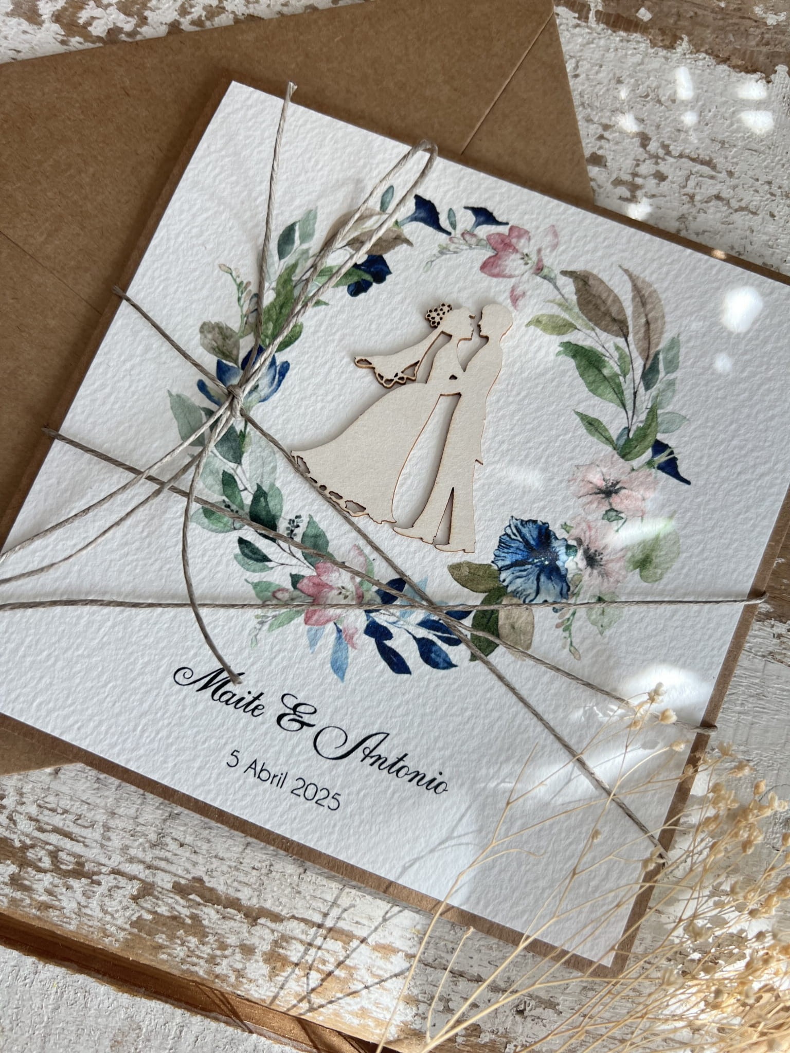 Kartka wykonana jest z najwyższej jakości starannie dobranych materiałów i dodatków w tym papieru kraftowego, ekologicznego papieru bawełnianego - 100% bawełny. w odcieniu śmietanki, tekturtkowych ozdób. Personalizowana na przodzie w postaci imion, daty ślubu, życzeń.