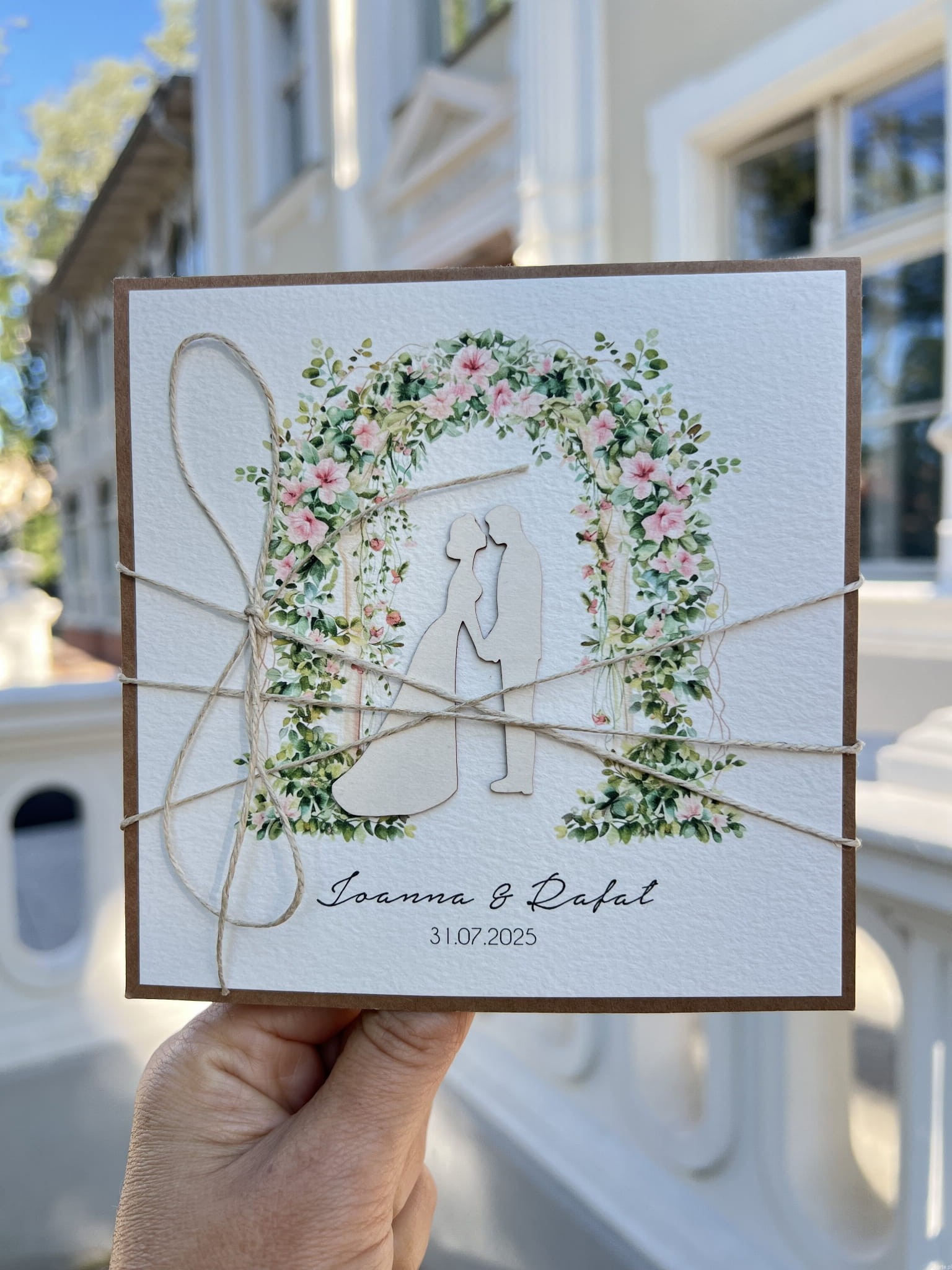 Kartka wykonana jest z najwyższej jakości starannie dobranych materiałów i dodatków w tym papieru kraftowego, ekologicznego papieru bawełnianego - 100% bawełny. w odcieniu śmietanki, tekturtkowych ozdób. Personalizowana na przodzie w postaci imion, daty ślubu, życzeń.