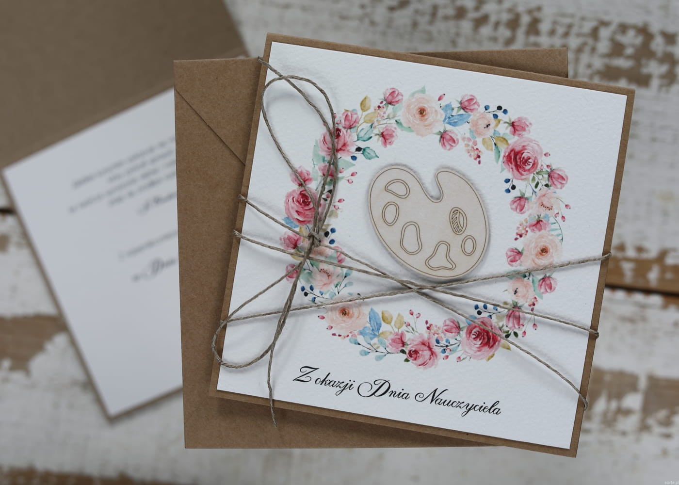 Kartka wykonana jest na bazie papieru kraftowego z użyciem starannie wyselekcjonowanego papieru bawełnianego w kolorze ecri oraz ozdoby tekturkowej. Zestaw przewiązany jest lnianym sznureczkiem.