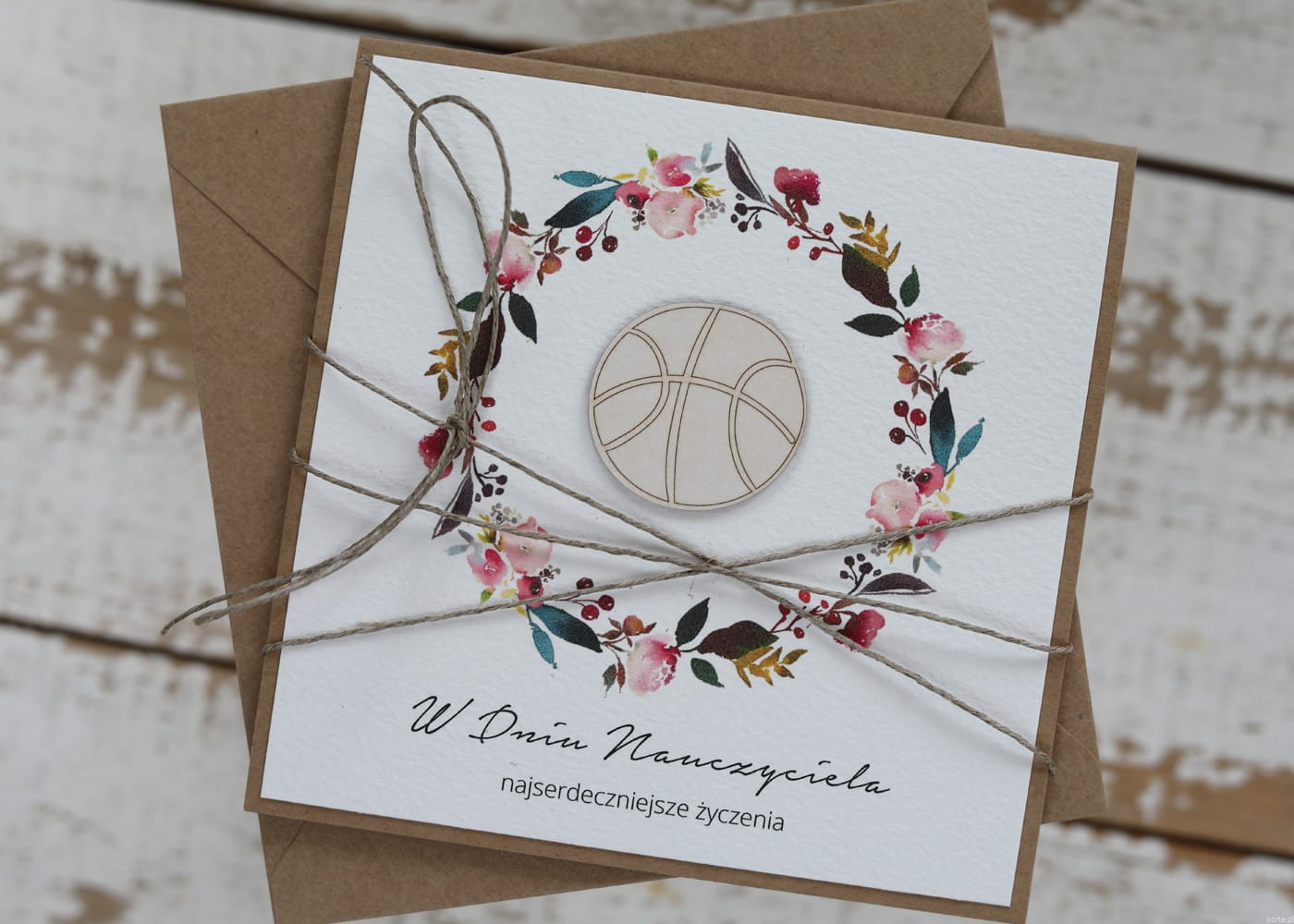 Kartka wykonana jest na bazie papieru kraftowego z użyciem starannie wyselekcjonowanego papieru bawełnianego w kolorze ecri oraz ozdoby tekturkowej. Zestaw przewiązany jest lnianym sznureczkiem.