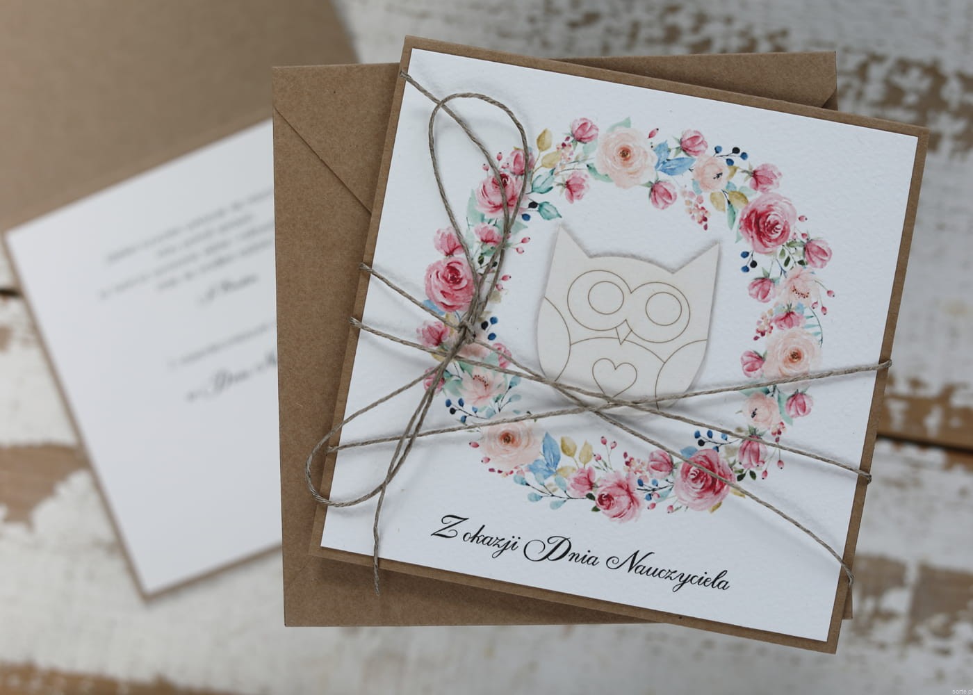 Kartka wykonana jest na bazie papieru kraftowego z użyciem starannie wyselekcjonowanego papieru bawełnianego w kolorze ecri oraz ozdoby tekturkowej. Zestaw przewiązany jest lnianym sznureczkiem.