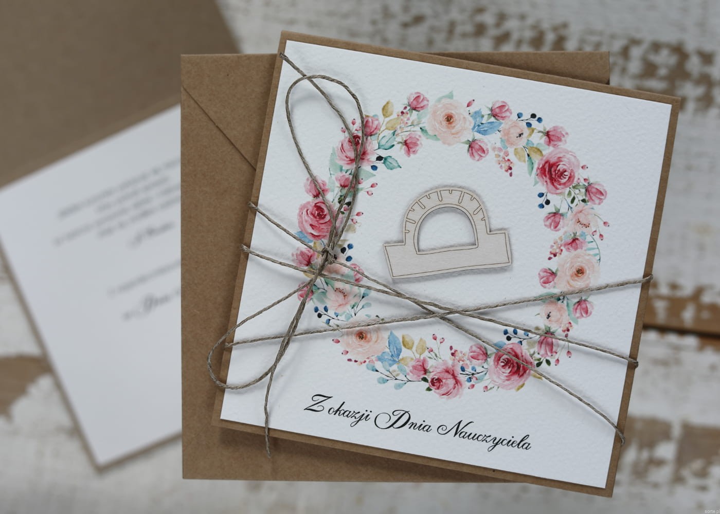 Kartka wykonana jest na bazie papieru kraftowego z użyciem starannie wyselekcjonowanego papieru bawełnianego w kolorze ecri oraz ozdoby tekturkowej. Zestaw przewiązany jest lnianym sznureczkiem.